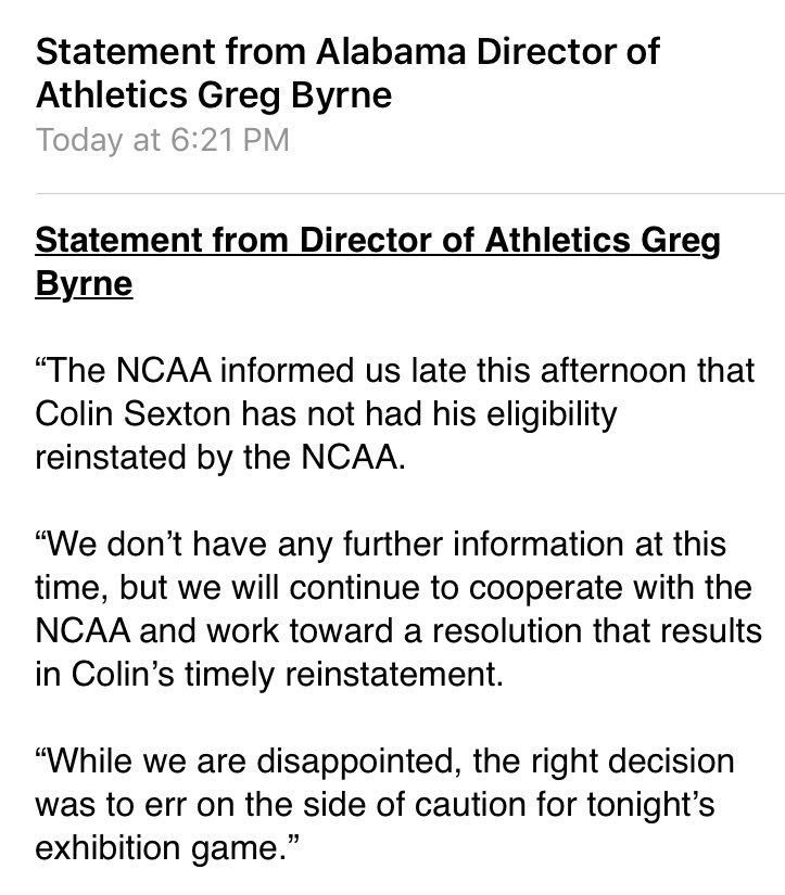 I have a bad feeling that Sexton will never play a minute for Bama.