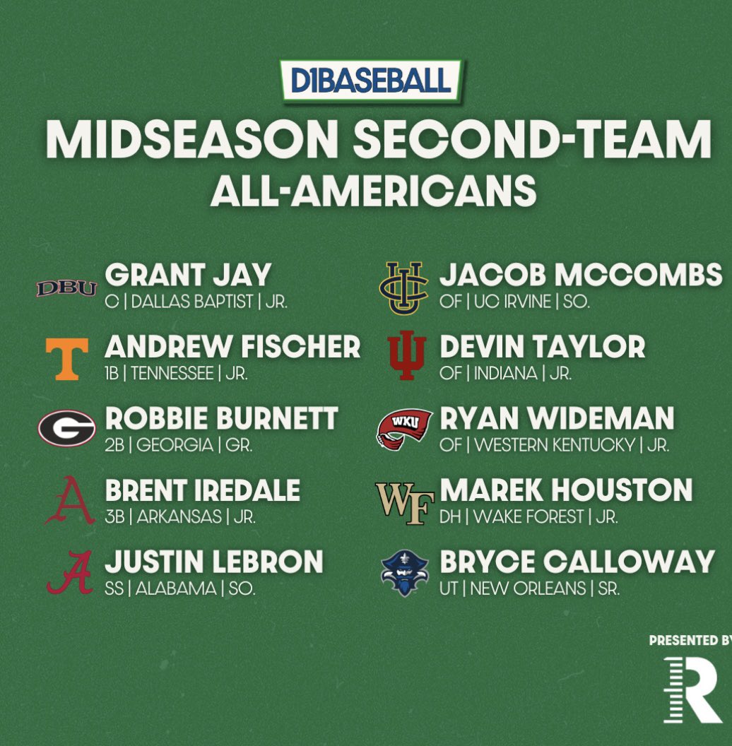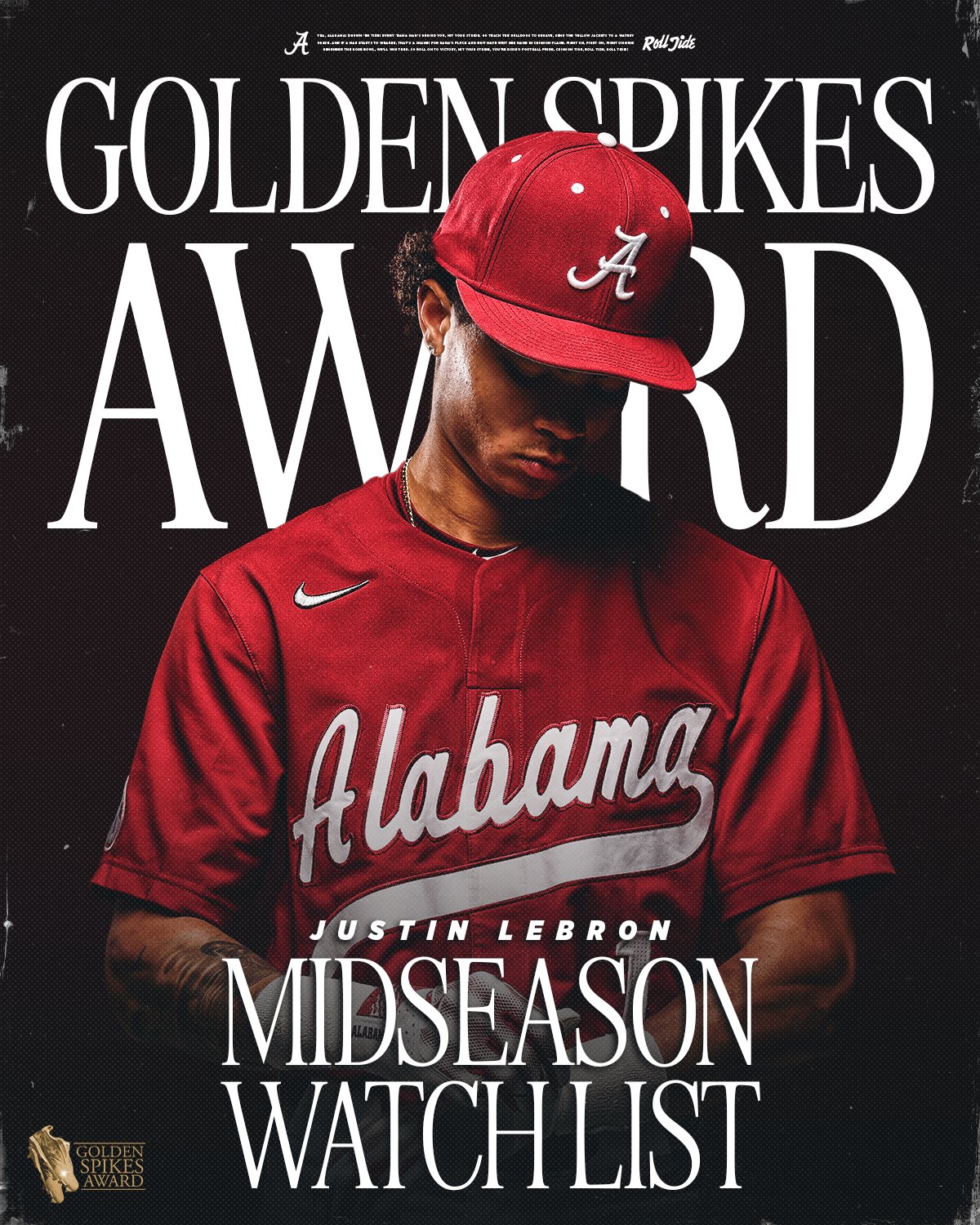 Alabama shortstop Justin Lebron was selected to the 2025 Golden Spikes Award Midseason Watch List, USA Baseball announced Thursday.