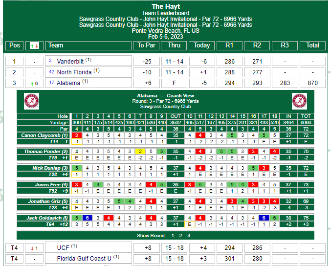 Still plenty of teams on the course, but the Tide has vaulted six spots up the leaderboard into third place overall with a 54-hole tournament total of 6-over 870!