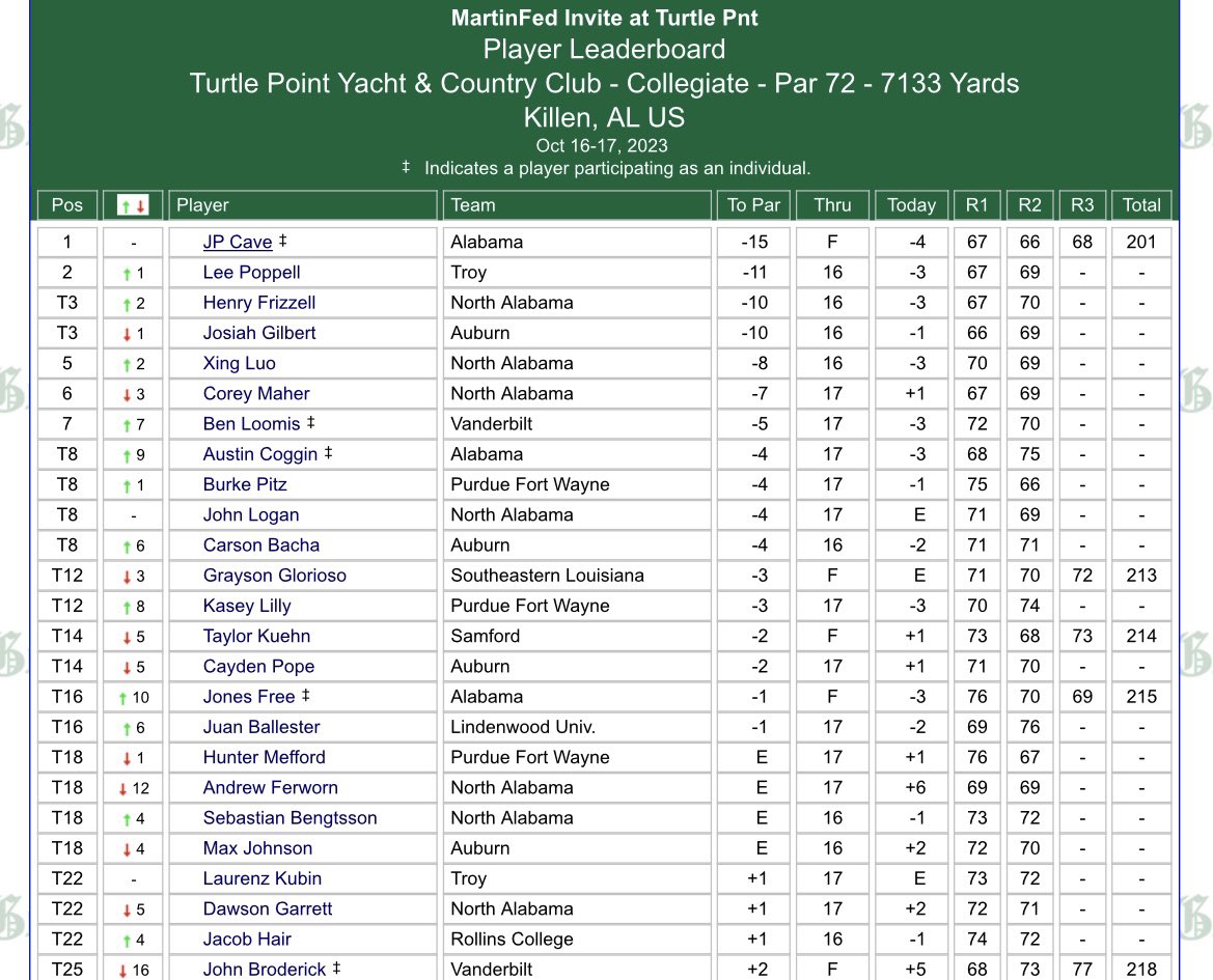 Third round action will begin at 7:45 a.m. CT, with Alabama teeing off the final grouping at 9:15 a.m. on the par 72, 7032-yard Steelwood Country Club. Live stats can be found at Golfstat.com.
