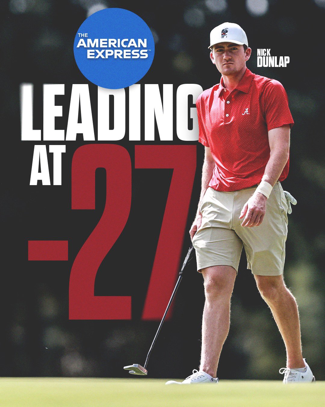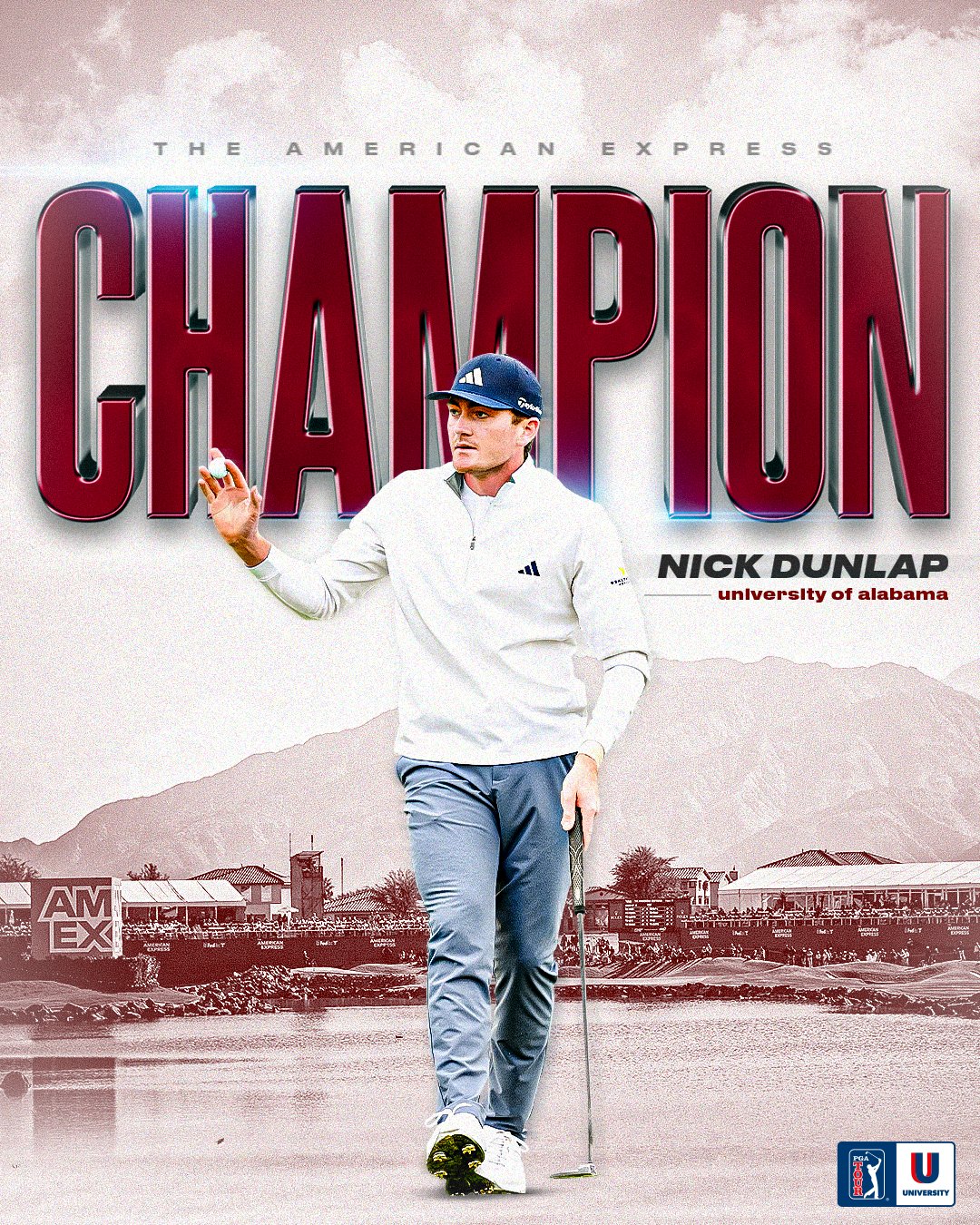 LA QUINTA, Calif. – University of Alabama sophomore men's golfer Nick Dunlap became the first amateur to win a PGA Tour event since 1991 when he claimed The American Express on Sunday evening. Dunlap won the event by one stroke over Christiaan Bezuidenhout, finishing the 72-hole tournament at 29-under par 259 (64-65-60-70).