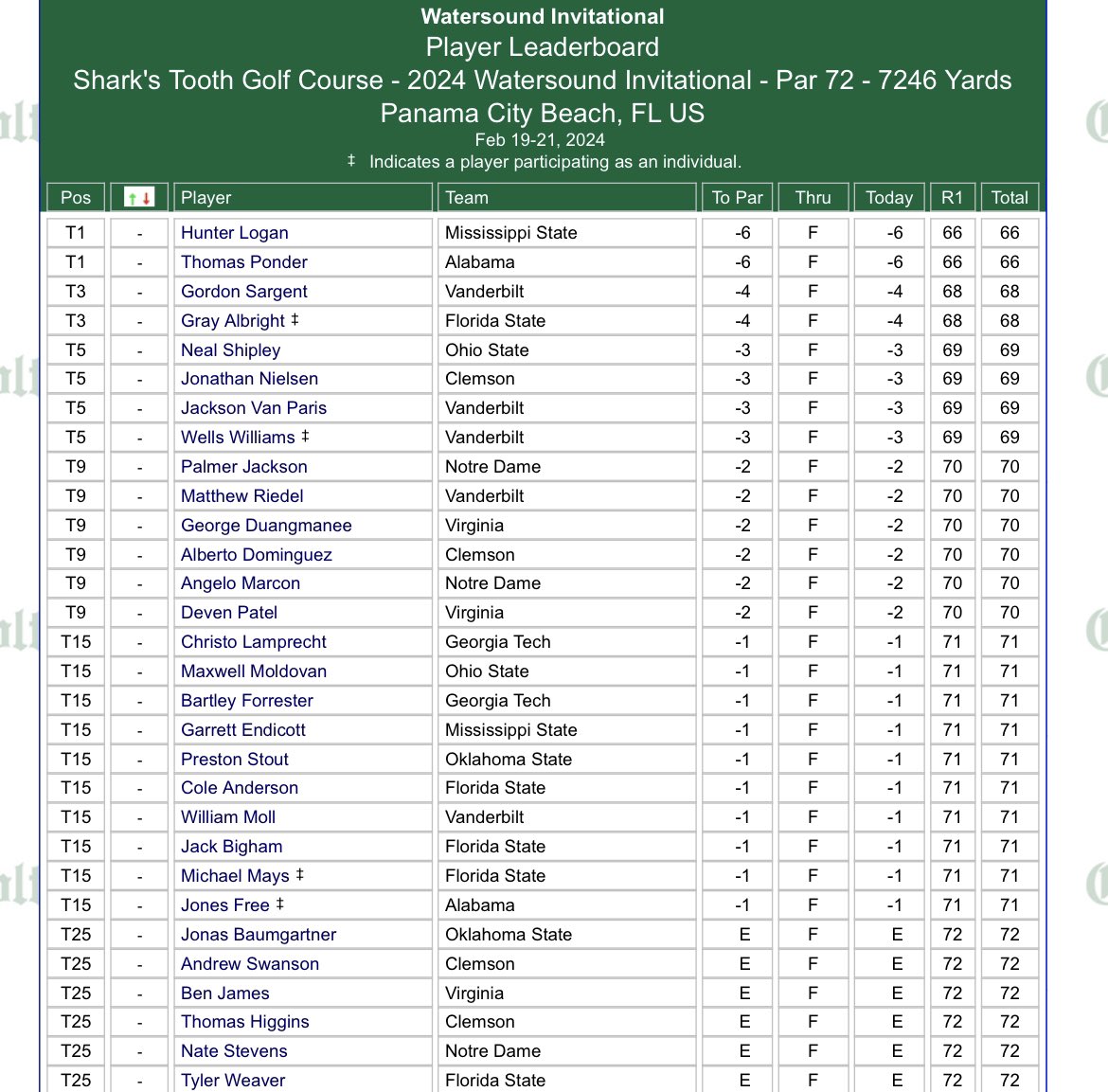 PANAMA CITY, Fla. – Alabama senior Thomas Ponder carded an opening round score of 6-under par 66 and owns a share of the overall lead after Monday's opening round of play at the Watersound Invitational. As a team, the Crimson Tide finished the day at 1-under par 287 and is in a tie for sixth place overall entering Tuesday's second round.