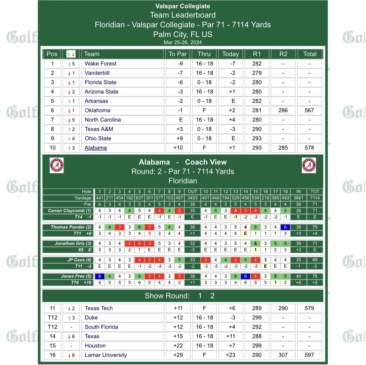 Canon Claycomb, who entered the week ranked No. 18 in the nation in the latest PGA TOUR University Rankings, led Alabama at 2-under par 212 (70-71-71) as he finished at-or-under par in all three rounds on the par 71, 7,114-yard Floridian Golf Course.