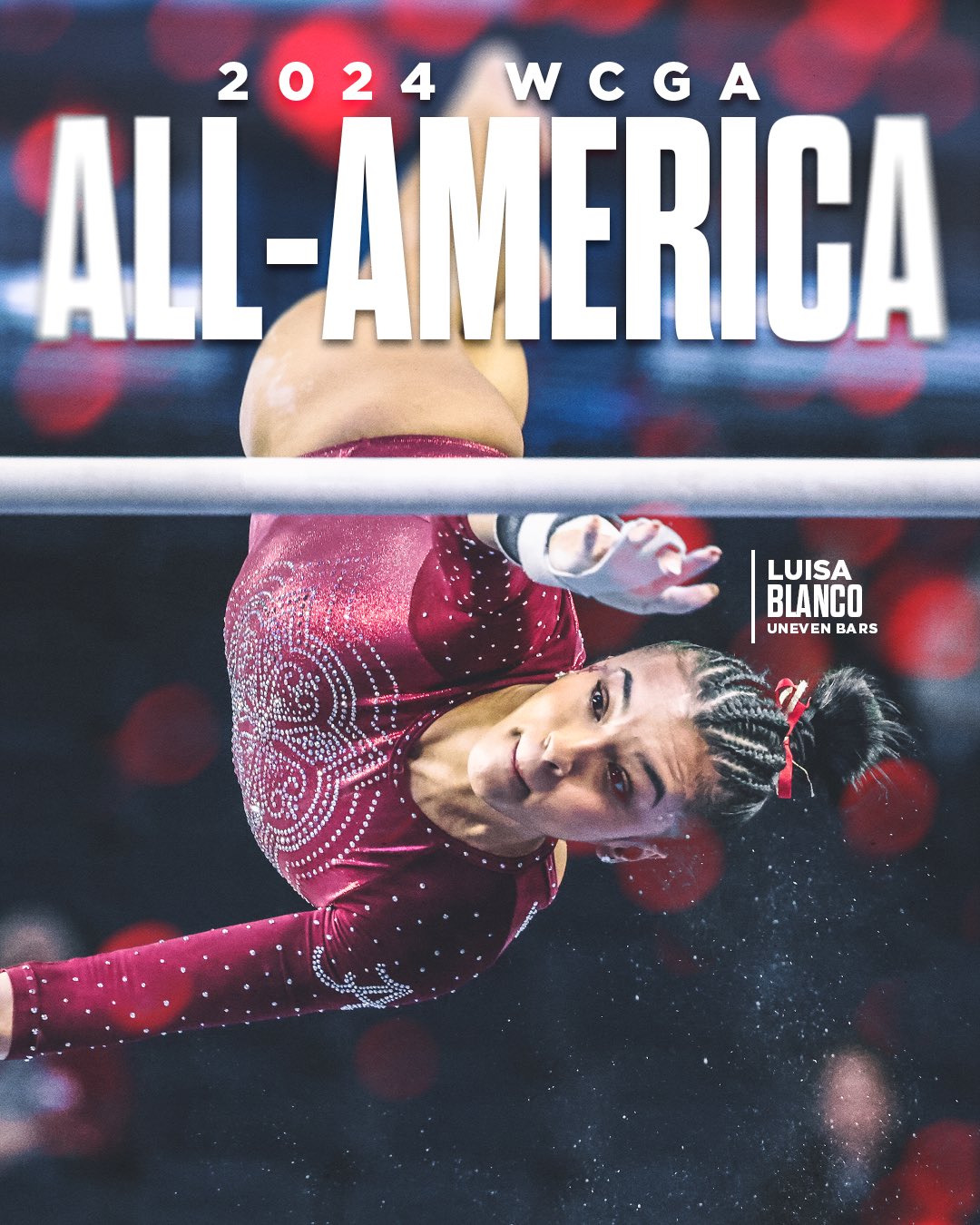 Luisa Blanco picked up second-team All-America honors after securing her sixth-straight score of a 9.9+ on the uneven bars