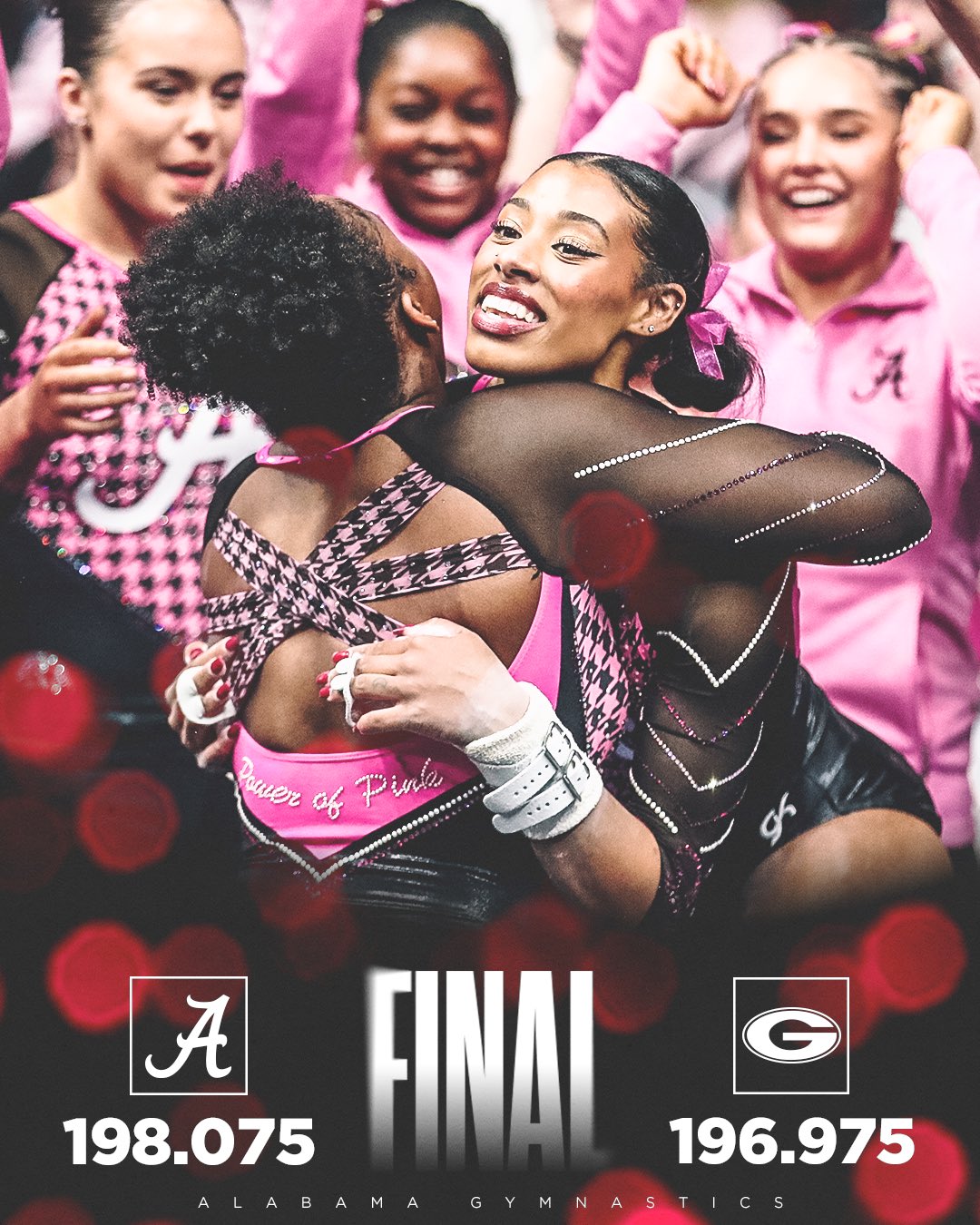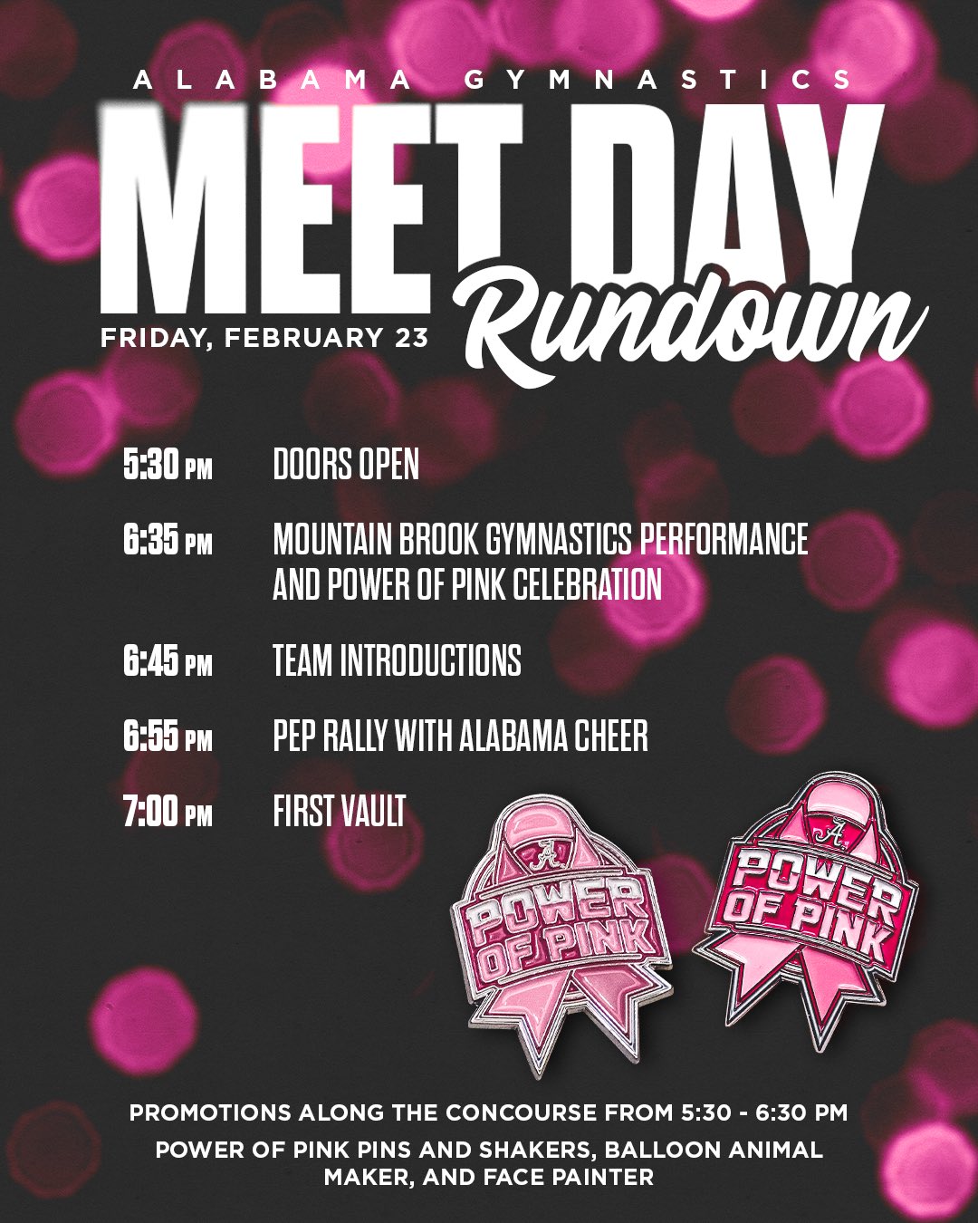The No. 10 Alabama gymnastics team will host the No. 18 Georgia Bulldogs Friday night in Coleman Coliseum for the 20th annual Power of Pink meet. The eighth-consecutive meet featuring a top-20 opponent for the Crimson Tide will begin at 7 p.m. CT and will be broadcasted on SEC Network+.