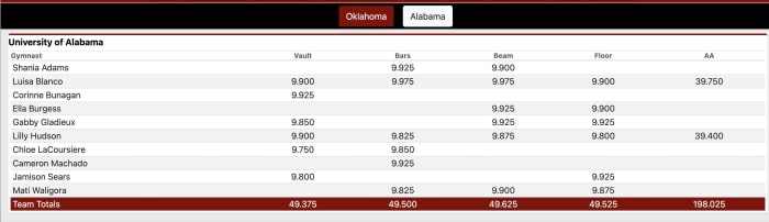 The Crimson Tide rolled to a 198.025 road score to become the first opponent this season to hit the 198 threshold against the No. 1 Sooners
