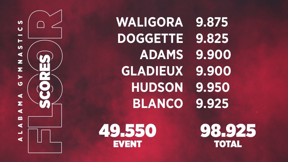 Alabama earned a 49.375 on balance beam to start off the meet, led by a 9.950 from Luisa Blanco. The Crimson Tide posted its highest rotation score of the night on floor exercise, a 49.550, to move into second place behind the top-seeded Florida Gators at the halfway point. Alabama maintained its position with a 49.525 on the vault, tying UA's season-best on the event, before closing out the night with a 49.400 on the uneven bars.