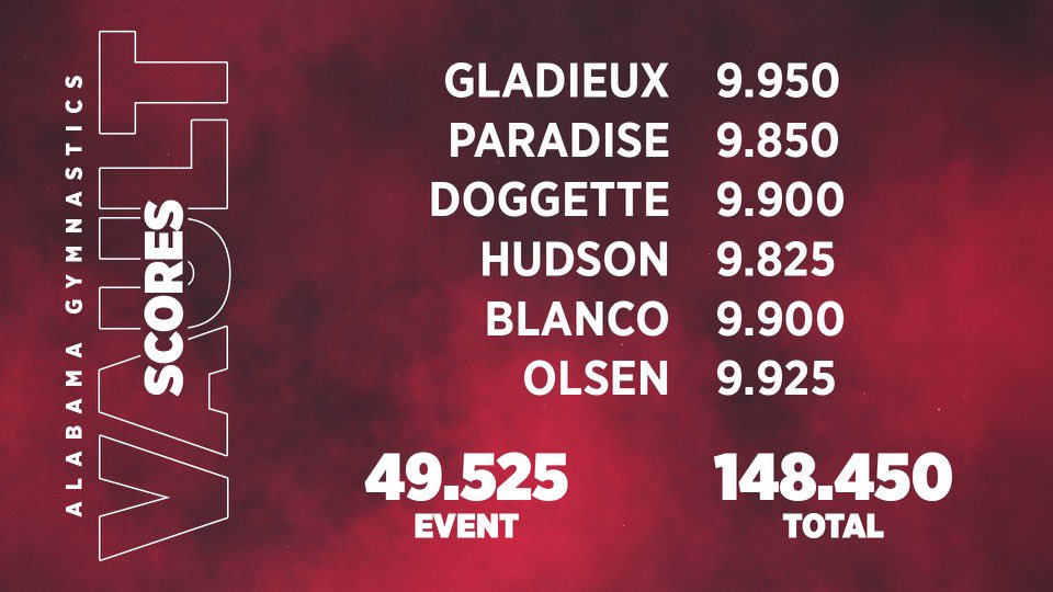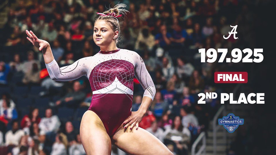 Big night for the ladies coming in 2nd at the SEC Championships. Gabby was Co SEC Champion on the vault and Bama came in 2nd in the rest of the individual scores. Florida with the W.