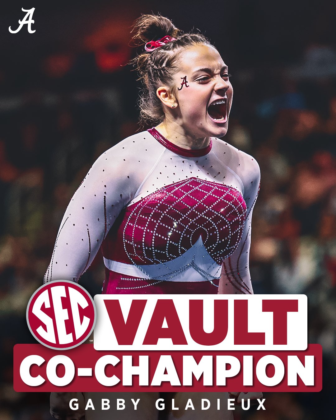 Freshman Gabby Gladieux earned the SEC title on the vault in a four-way tie, marking her first vault event title of the season. Gladieux scored a 9.950 in the leadoff position, earning a perfect score for her Yurchenko full, which has a start value of 9.950.