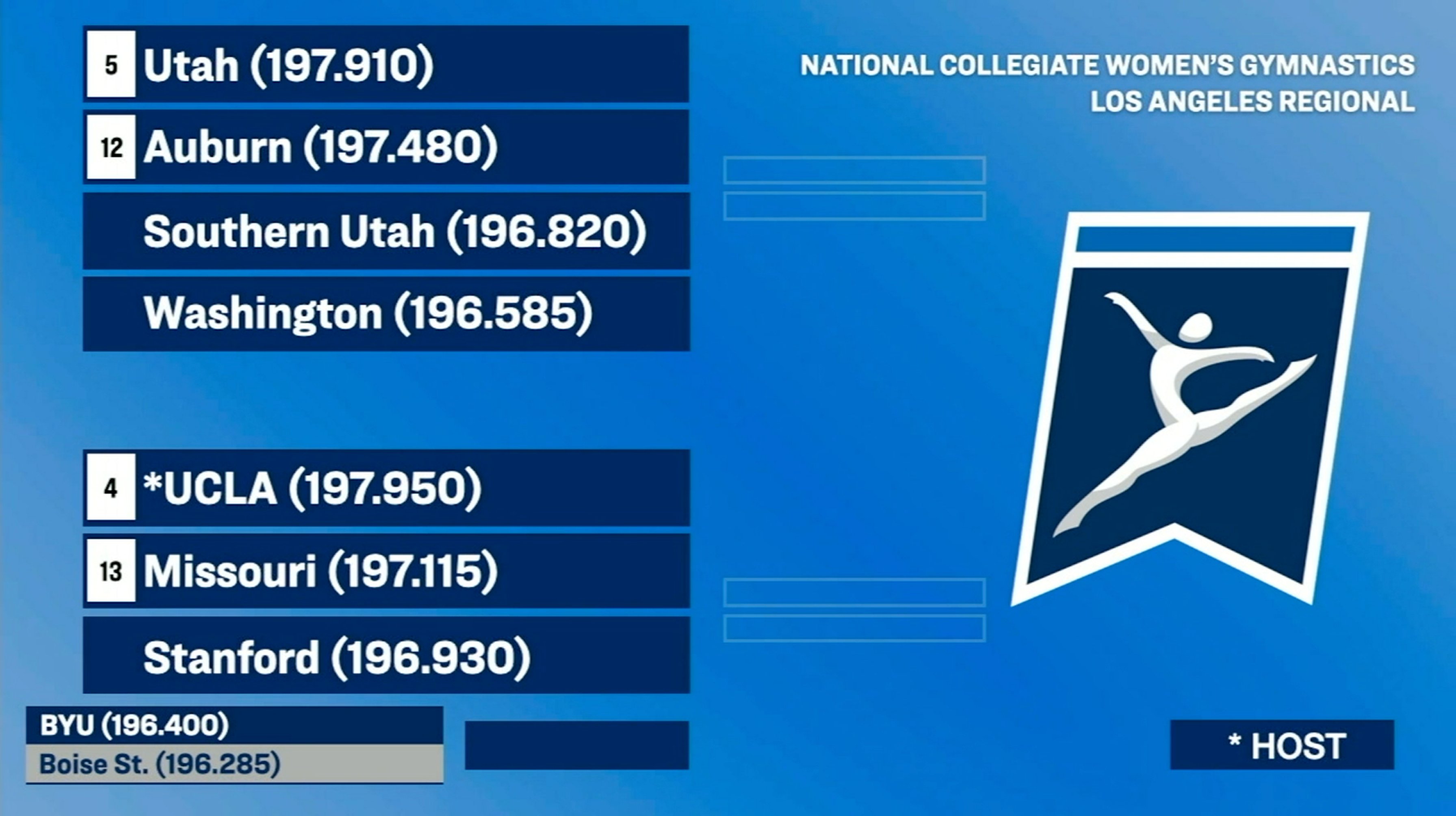 UF scored .5 better than the second place team. That is a Yuge margin. I think LSU coming in third was the biggest shocker. But a great second place for Bama. I think it will take 198.4 to win it all this year. Bama probably wont make the finals which only takes 8 teams. They would have to put up at least 198 to make it their. Good luck