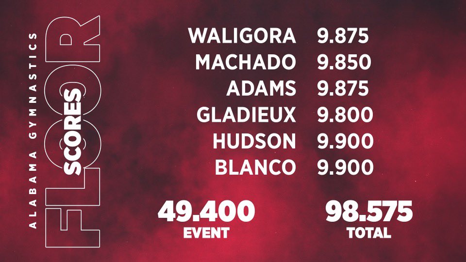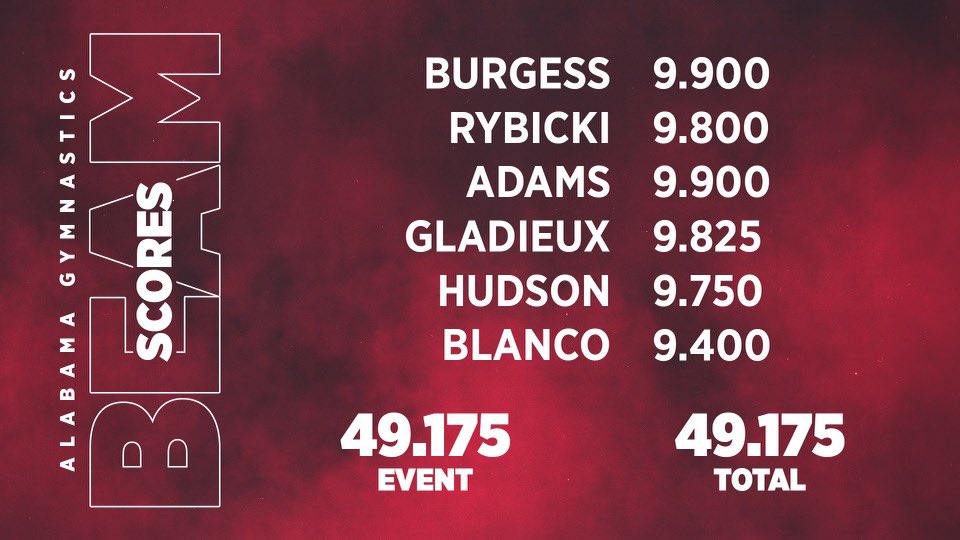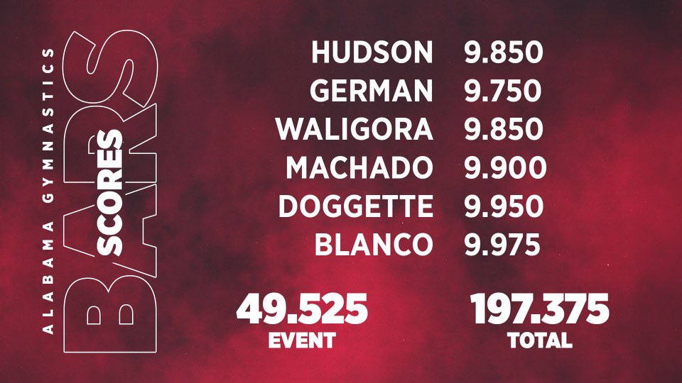 Oklahoma and Kentucky advance. Bama with a 197.650 but it’s not enough.