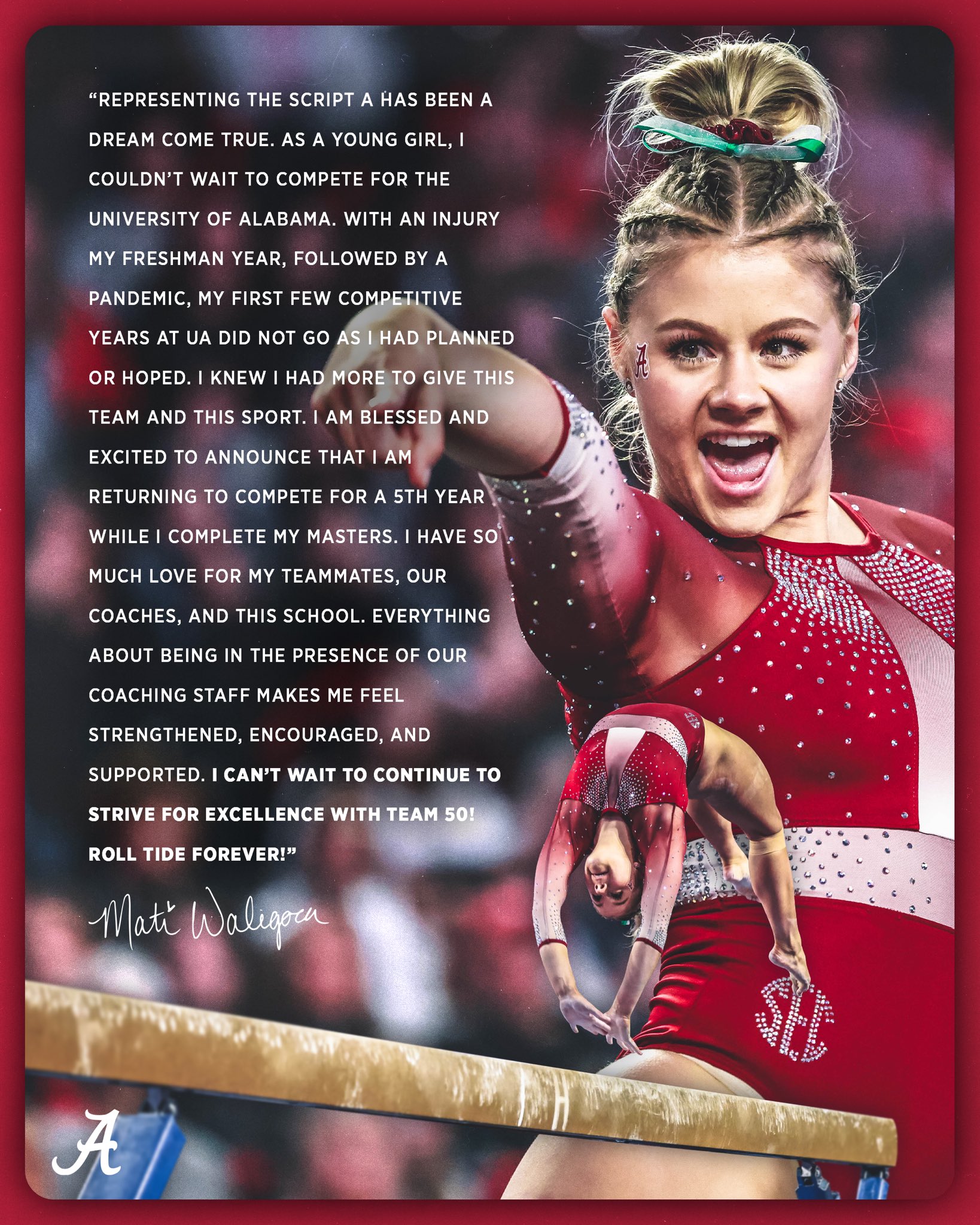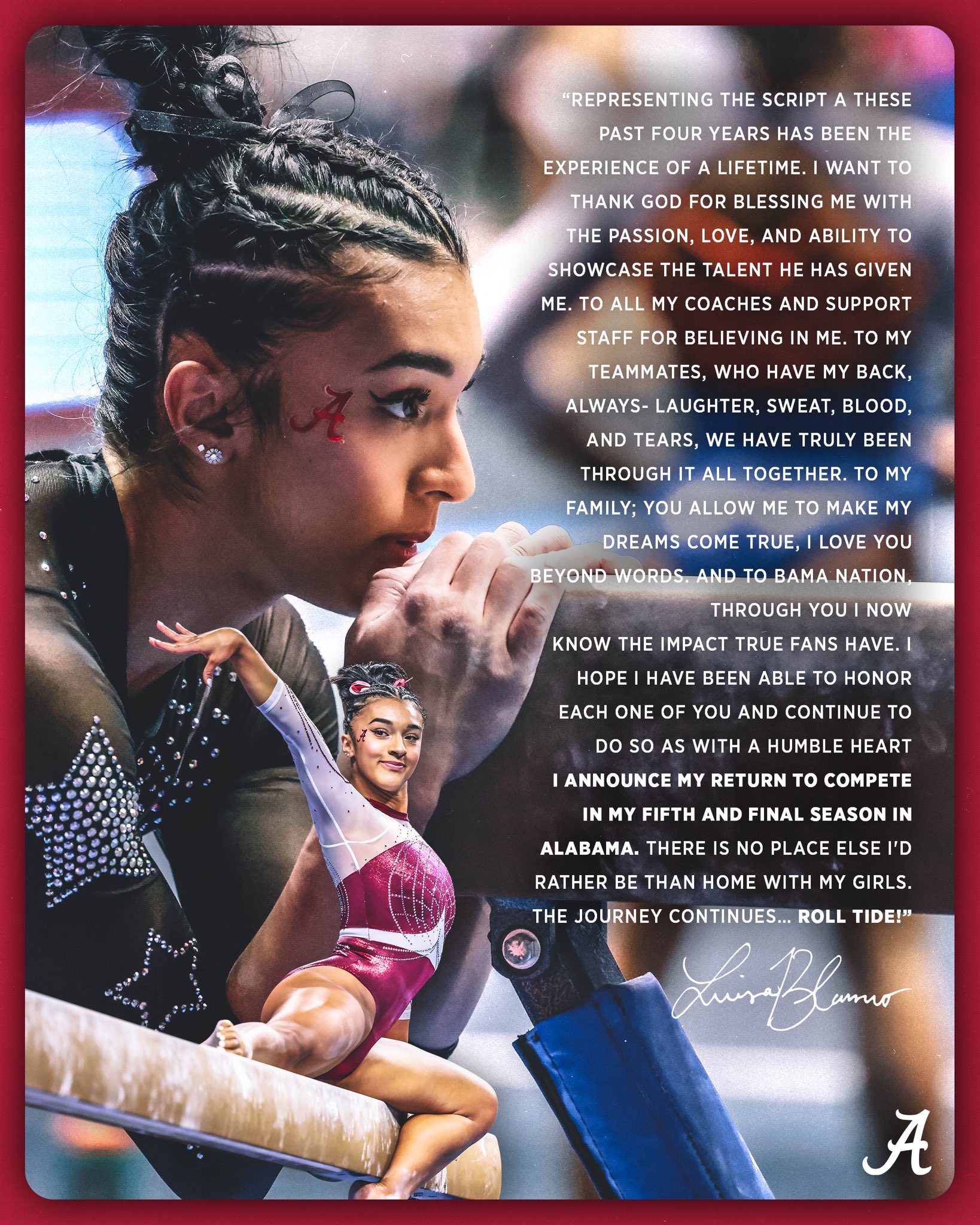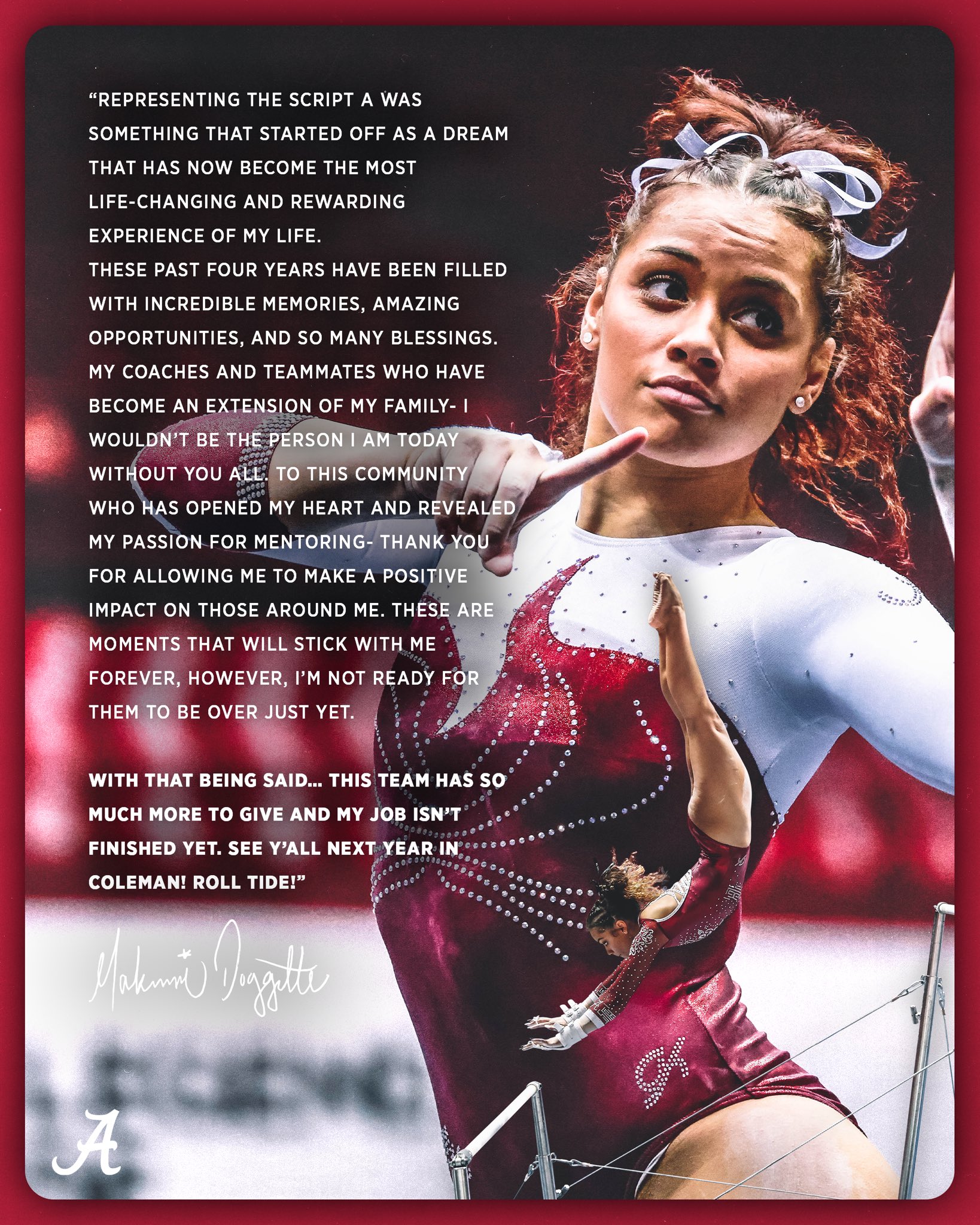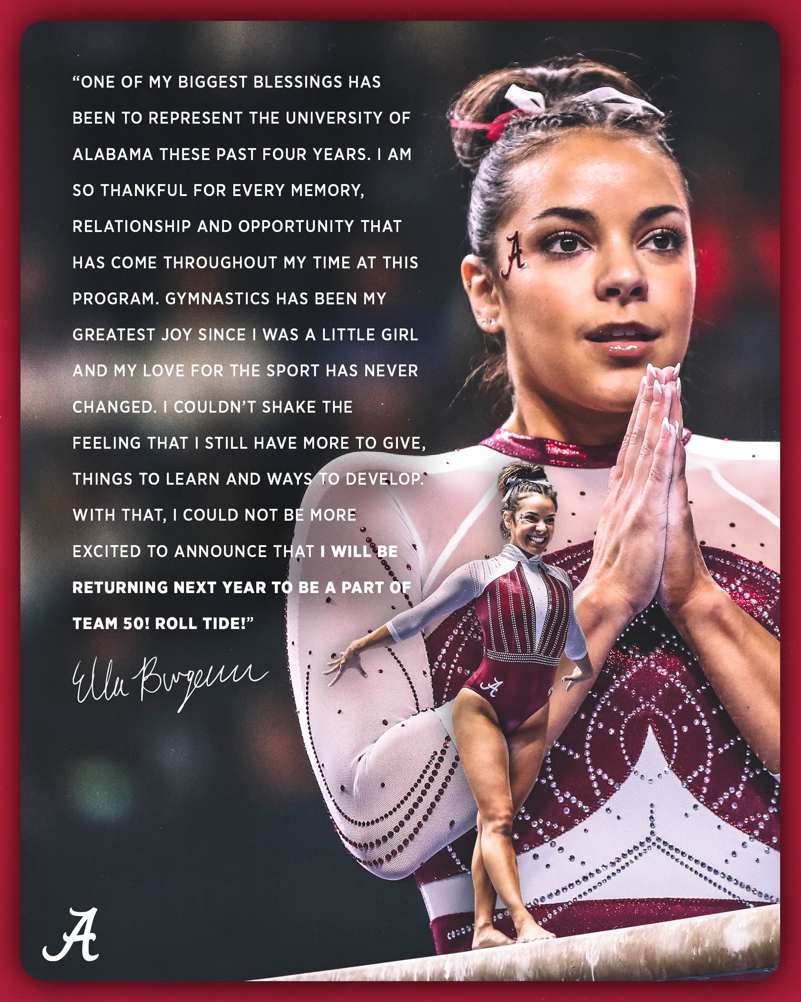 "I am beyond excited for the opportunity to join the Alabama gymnastics coaching staff! I feel honored to work alongside such an amazing group of coaches that prioritize the well-being of student-athletes. I look forward to connecting with each of the team members and working together towards a common goal while enjoying the sport we all love. I believe in this program, and I can't wait to help continue the legacy that is Alabama Gymnastics. Roll Tide!"