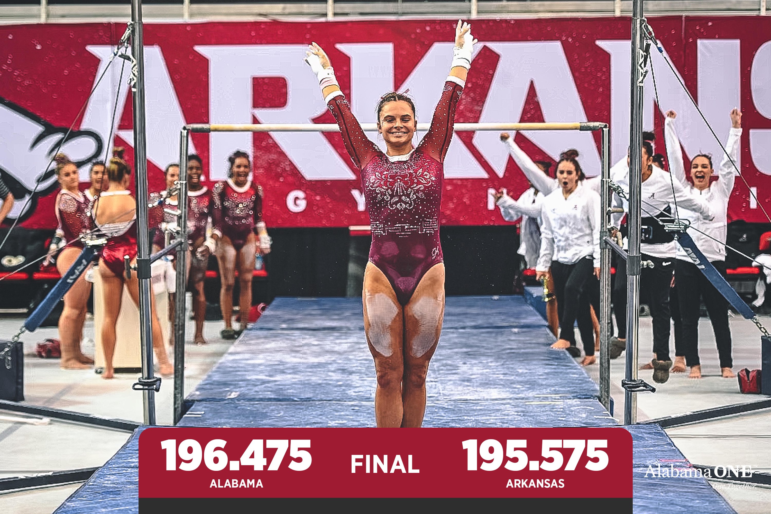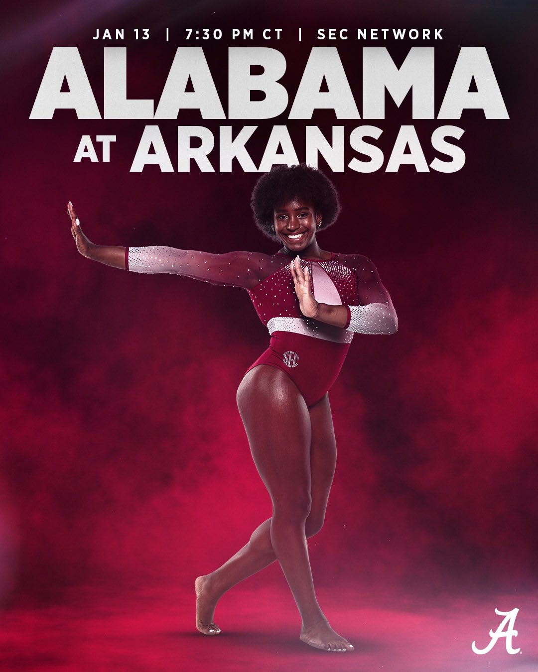 The No. 8 Alabama gymnastics team will open its Southeastern Conference schedule against the No. 16 Arkansas Razorbacks Friday night at 7:30 CT in Barnhill Arena. The contest will be the Crimson Tide's first road meet of the season.