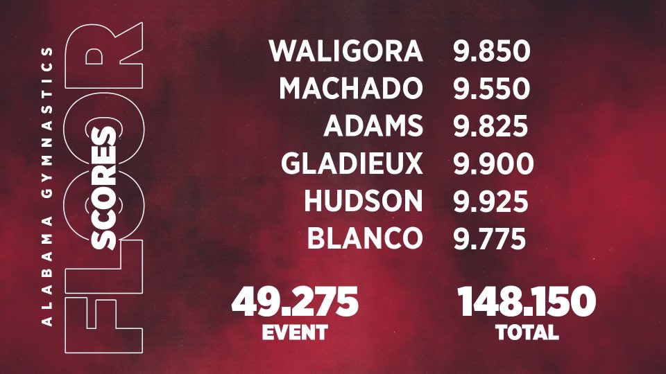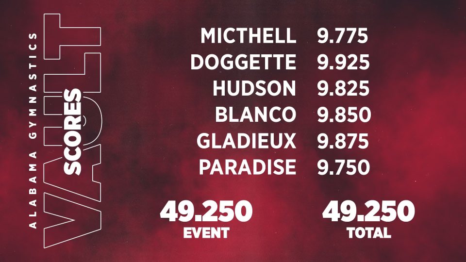Thought this thread might be active. Bama with a 10 on the beam but trailing going into final rotation.