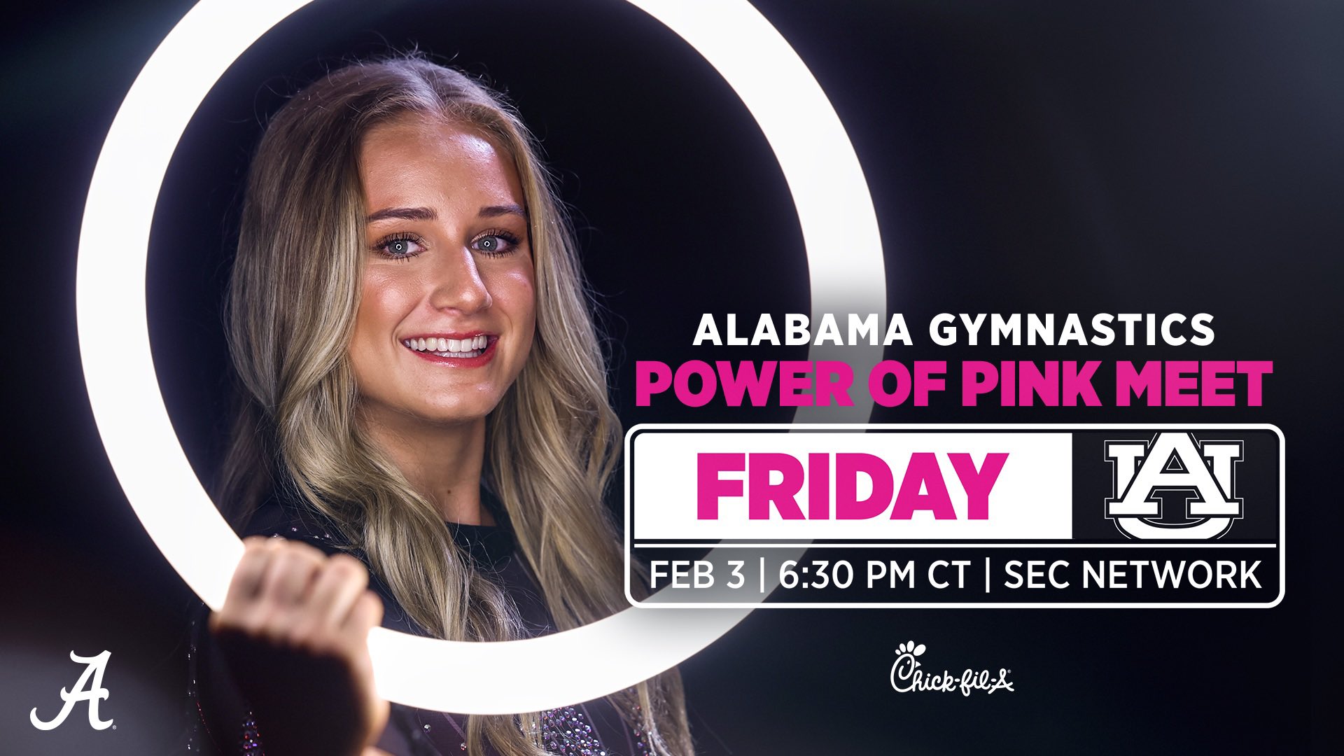 The No. 11 Alabama gymnastics team will host the No. 6 Auburn Tigers Friday Night in Coleman Coliseum. The meet is Alabama's annual Power of Pink event, started 19 years ago by Sarah Patterson.