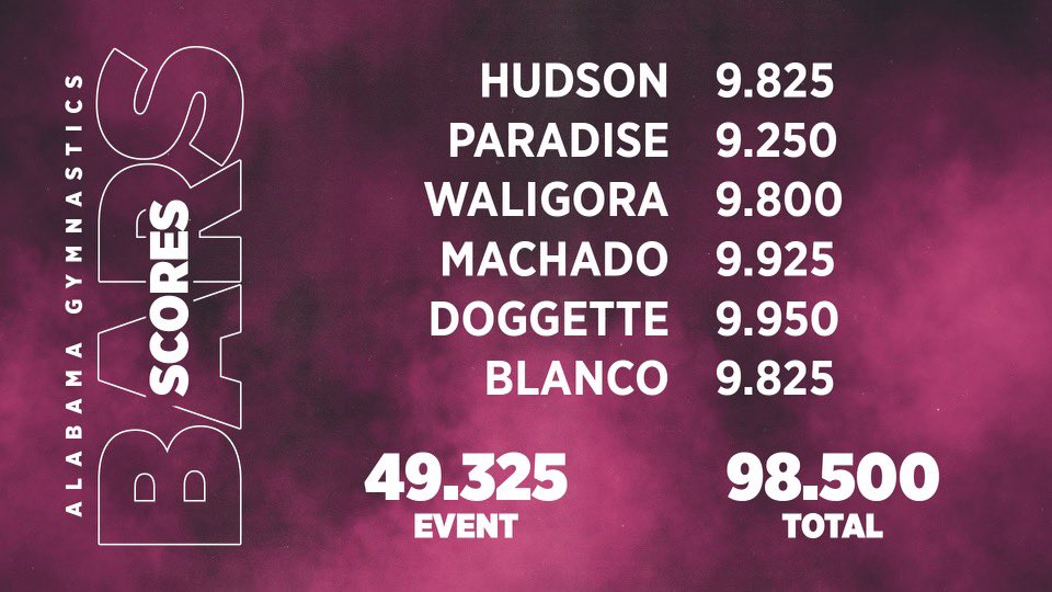 Following a 49.175 on the vault to open the meet, the Tide's rotation scores got higher after each rotation. Alabama followed a 49.325 on the uneven bars with a 49.650 on the balance beam, tying for the second-highest total on the event in program history. The Tide closed out the night with a 49.700 on floor exercise, tying a program record on the event.