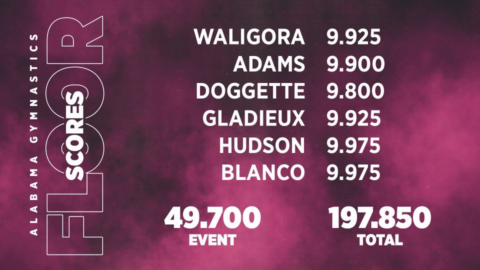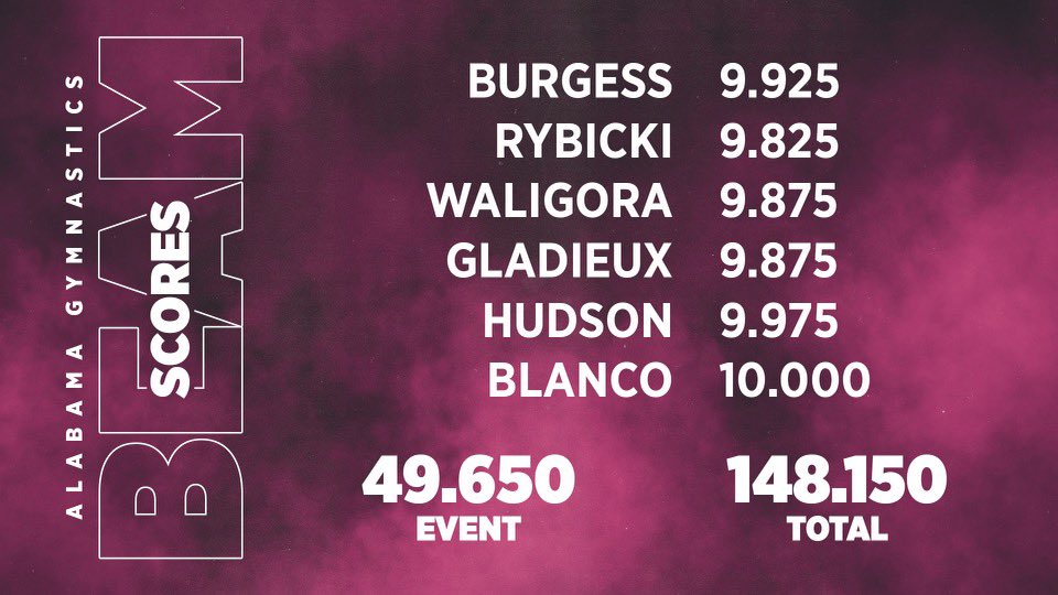 Luisa Blanco scored a perfect 10 on the balance beam and anchor Alabama in the third rotation of the night, earning the second 10.0 of her career. Blanco posted a 39.750 in the all-around, tying her career high on the vault (9.950), the balance beam (10.0) and floor exercise (9.975), receiving at least one 10.0 from a judge on all three events.