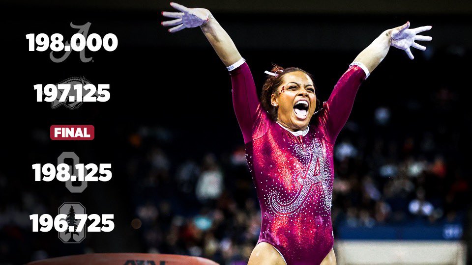 Alabama and Oklahoma went back-and-forth throughout the competition, with the Tide earning a 49.425 on the uneven bars to open the meet with the team lead. UA scored another 49.425 on the balance beam in the second rotation of the night to total a 98.850 at the halfway point, right behind the Sooners at 99.050. Alabama came back strong with a 49.625 on floor exercise, closed out with three consecutive 9.950s, to take a 148.475-148.450 lead heading into the final rotation. Alabama closed out the night with a season-high 49.525 on vault, closing out its season-high team total of 198.000.