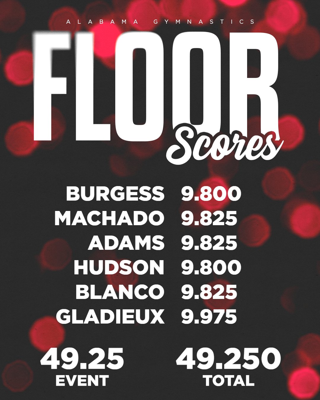 Sophomore Gabby Gladieux claimed the event title on floor exercise behind a career-high score of 9.975, while super senior Luisa Blanco earned a share of the event title on uneven bars (9.950) before also posting a 39.550 in the all-around for second place. Senior Shania Adams was awarded her own share of an event title on balance beam behind a 9.900 performance, as Blanco and sophomore Karis German's 9.900 on vault had the duo finish tied for third.