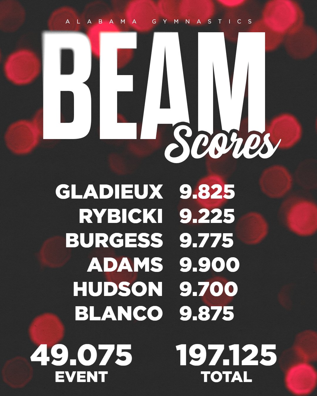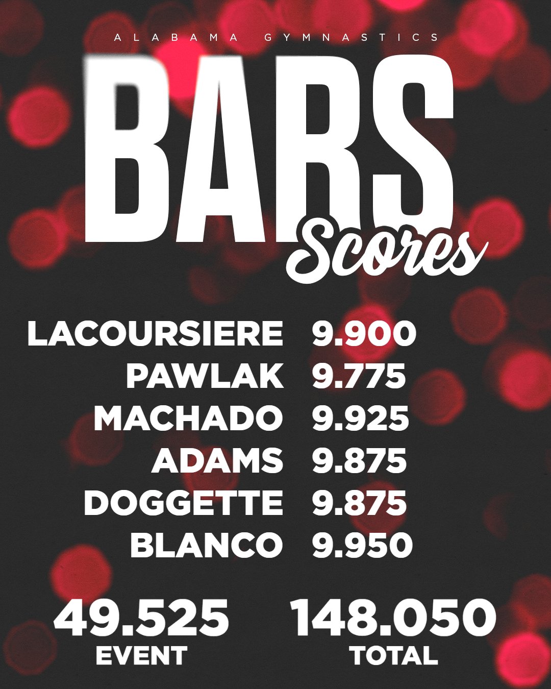 Freshmen Chloe LaCoursiere and Jamison Sears, plus sophomore transfer Natalia Pawlak each made their Crimson Tide debut across vault and bars. LaCoursiere's and Sears' performances on uneven bars and vault, respectively, helped aid Alabama to its top-two event totals of the night. LaCoursiere's 9.9 on bars pushed UA to its highest event score of the night at 49.525, while Sears' 9.85 on vault helped earn the Tide's second highest event total, 49.275.