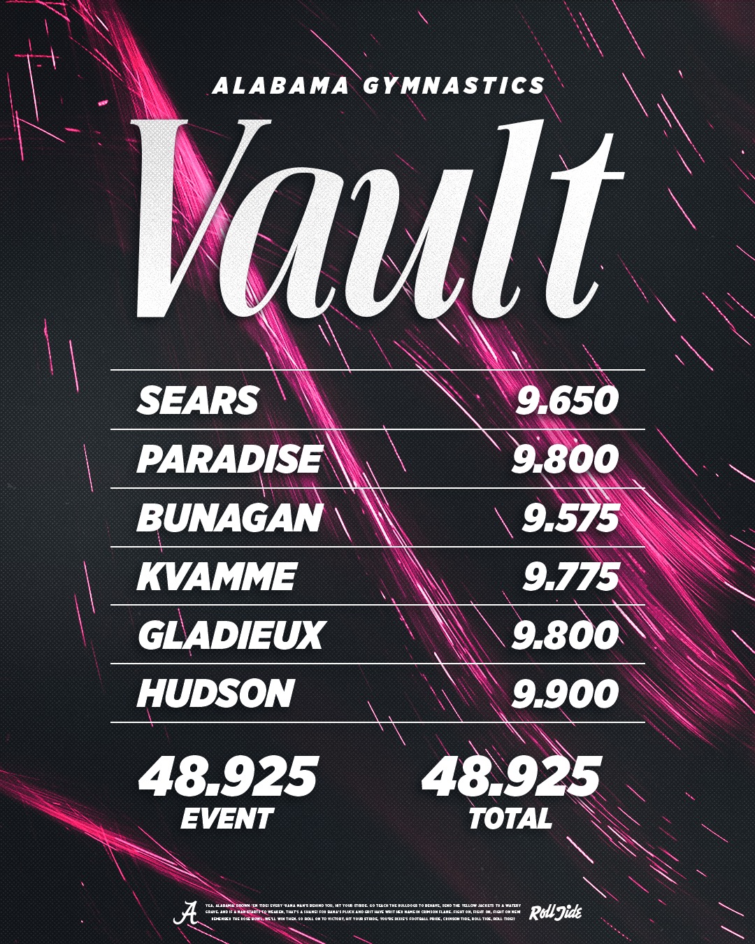 Great floor rotation for Bama. Meet of the year through three.