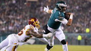 Jonathan Allen sacks Hurts with one arm while being blocked.