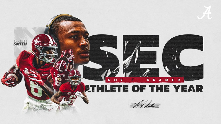 TUSCALOOSA, Ala. – Former Alabama wide receiver and Heisman Trophy winner DeVonta Smith was named the 2020-21 Roy F. Kramer SEC Male Athlete of the Year by a vote of the league's athletics directors, SEC Commissioner Greg Sankey announced Wednesday.