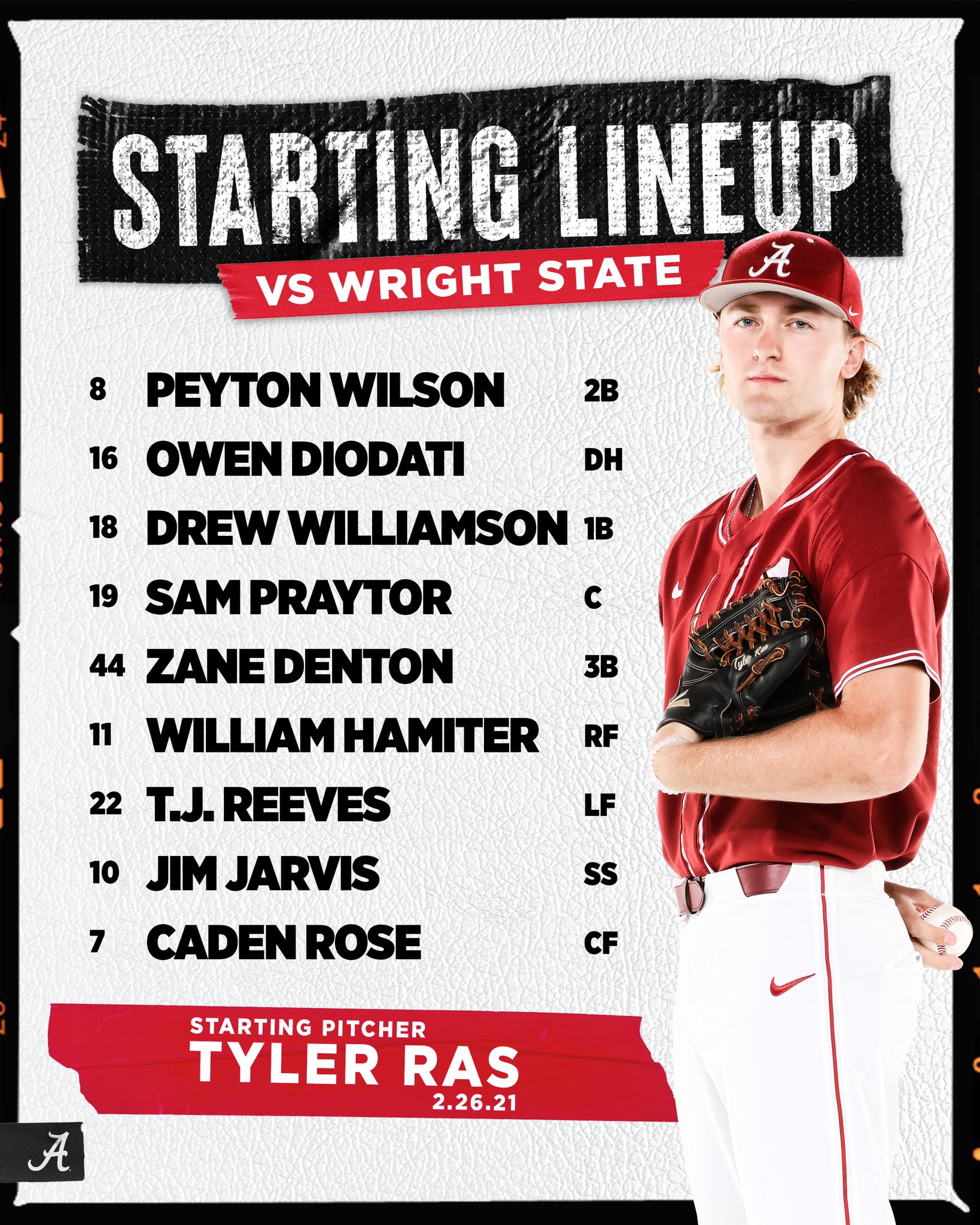Due to impending weather, Alabama Baseball’s Sunday (2/28/21) matchup with Wright State has been changed to a doubleheader on Saturday 2/27/21. The first game will begin at 1pm with the second game to start 30 minutes after the conclusion of the first game. Gates will open at 12pm. The first game will be a 9 inning game, while the second game will be 7 innings.