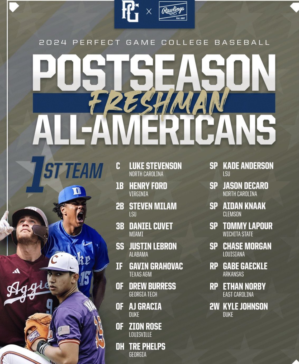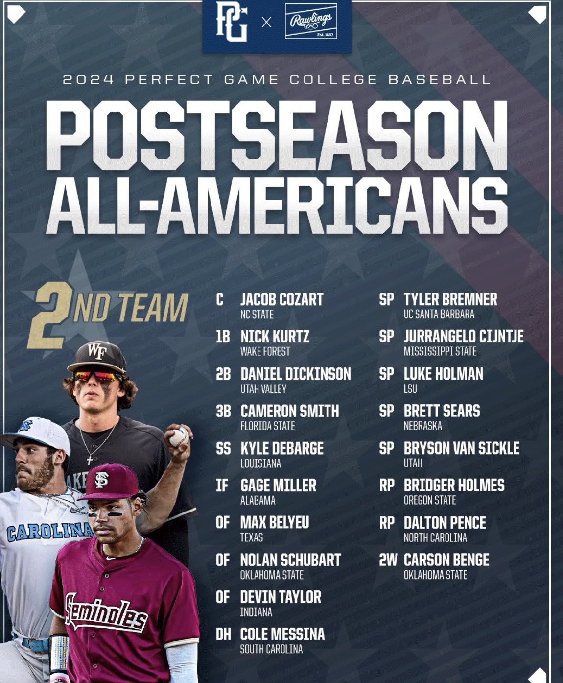 Justin was named to the 2024 ABCA/Rawlings Division I All-Southeast Region First Team.