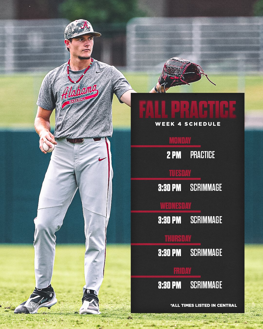 Alabama will break for the weekend before returning to the diamond on Monday. Next on the fall exhibition slate is a matchup with Florida State on Saturday, Oct. 28. The Crimson Tide and Seminoles are slated for a 12 p.m. CT first pitch at The Joe.