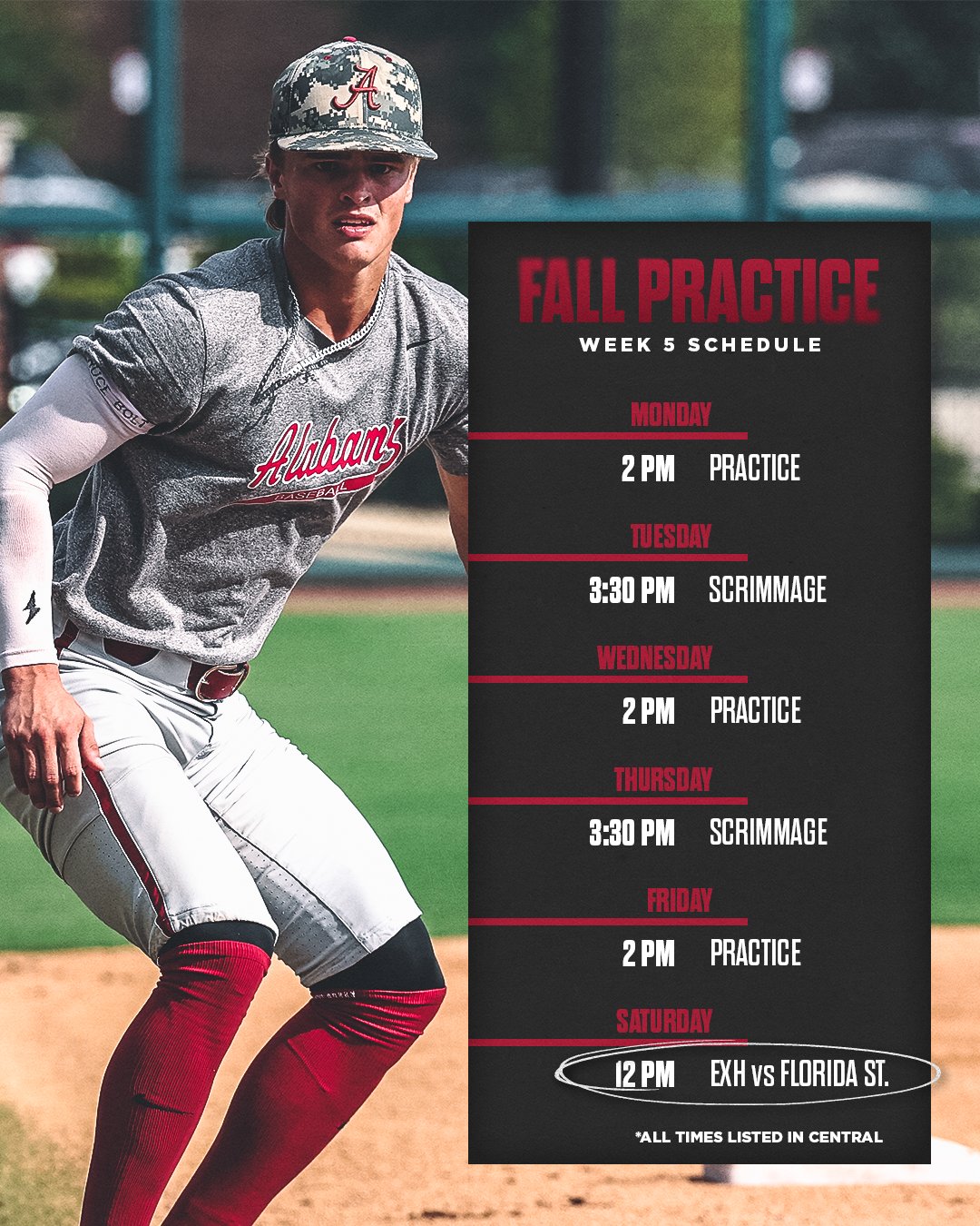 TUSCALOOSA, Ala. – Alabama baseball will host Florida State this Saturday, Oct. 28 with the exhibition scheduled for a 12 p.m. CT first pitch. More details about the exhibition can be found below.