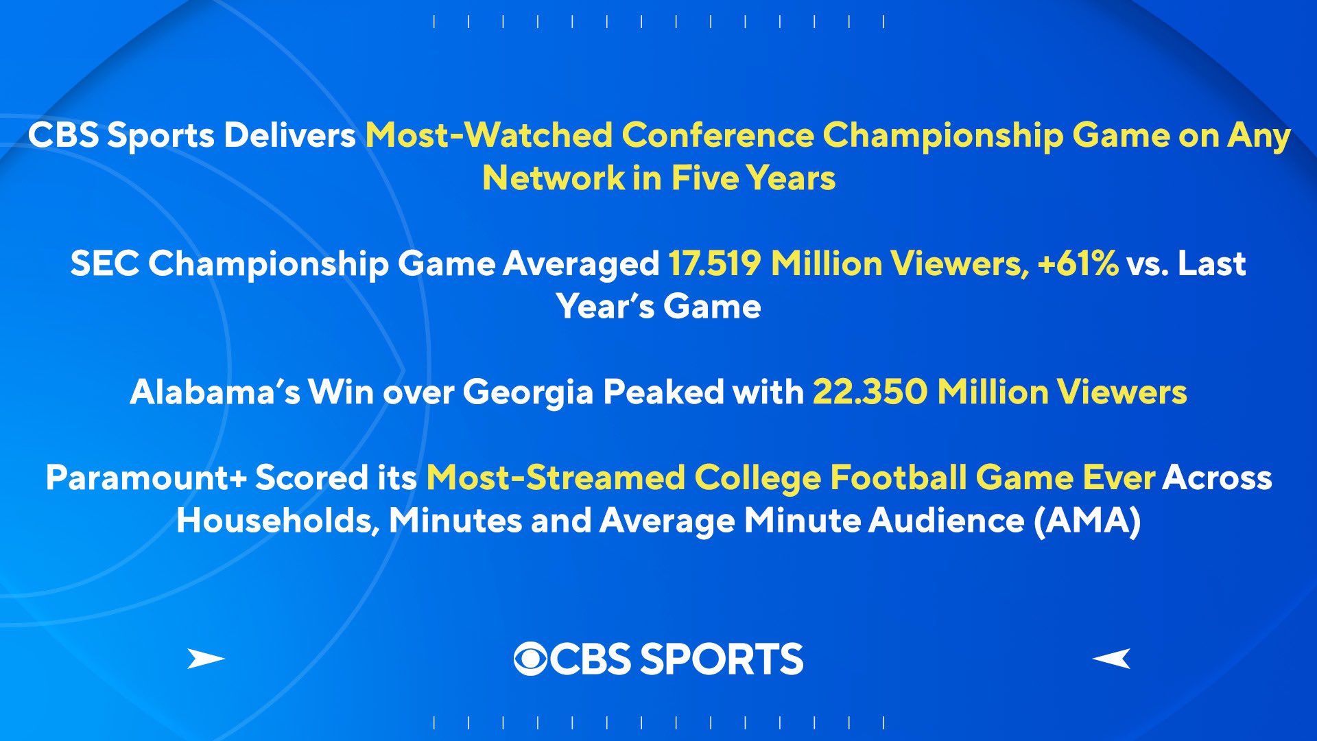 The No. 8 Crimson Tide’s 27-24 victory against the No. 1 Bulldogs at Mercedes-Benz Stadium in Atlanta averaged 17.52 million viewers on CBS, the network announced Tuesday, making it the most-watched conference championship game on any television network in five years.