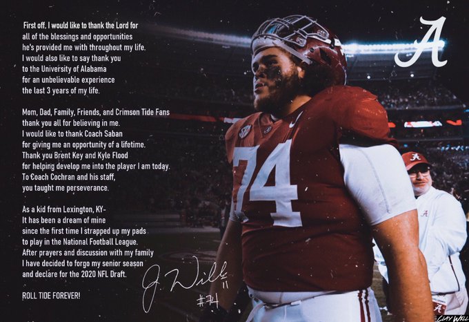 Alabama junior right tackle LINK ]Jedrick Wills has made his decision. On Saturday, Wills announced he will forego his senior season and declare for the 2020 NFL Draft.