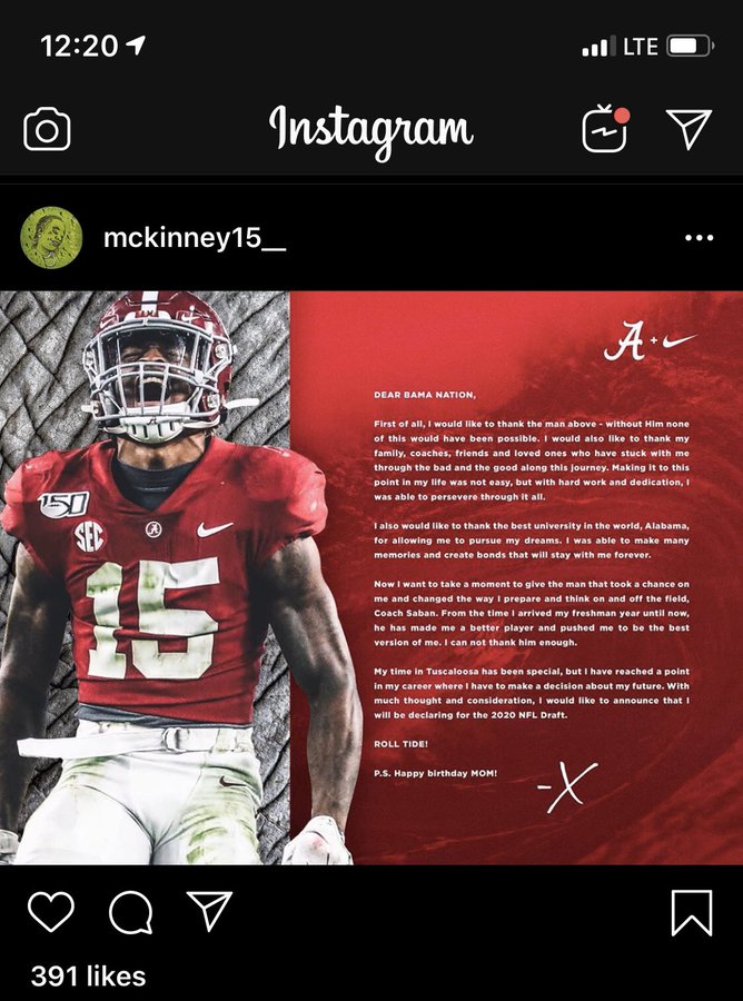 Alabama junior safety LINK ]Xavier McKinney has made his decision. The Crimson Tide’s leading tackler will forego his senior season and enter the NFL draft, McKinney said in his announcement on Instagram. . .
