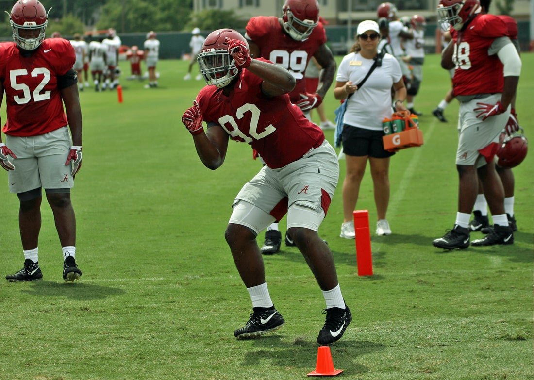 TUSCALOOSA, Ala. — Alabama held its seventh practice of fall camp Friday as players participated in their final workout before Saturday’s scrimmage. Players were dressed in shorts and shells and worked under partly cloudy, 91-degree weather. Here are some notes from the media viewing period.
