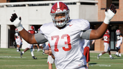 -- Watching the offensive linemen, the first group through drills consisted of Evan Neal at left tackle, Javion Cohen at left guard, Chris Owens at center, Emil Ekiyor at right guard and Kendall Randolph at right tackle. The second unit that I saw Monday featured Amari Kight at left tackle, Tommy Brown at left guard, Darrian Dalcourt at center, Tanner Bowles at right guard and JC Latham at right tackle. Damien George and Pierce Quick also worked at right tackle.