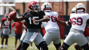 -- Watching the offensive linemen, the first group through drills consisted of Evan Neal at left tackle, Javion Cohen at left guard, Chris Owens at center, Emil Ekiyor at right guard and Kendall Randolph at right tackle. The second unit that I saw Monday featured Amari Kight at left tackle, Tommy Brown at left guard, Darrian Dalcourt at center, Tanner Bowles at right guard and JC Latham at right tackle. Damien George and Pierce Quick also worked at right tackle.