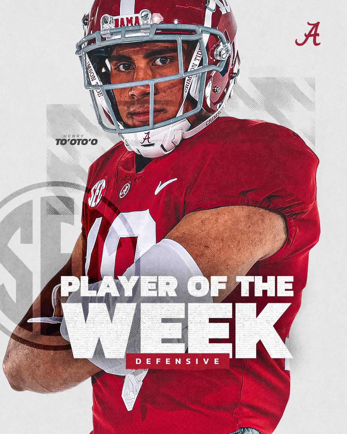 Ala. – Alabama's Bryce Young and Henry To'oTo'o each earned weekly honors from the Southeastern Conference, the league office announced on Monday. Young was named the league's Offensive Player of the Week while To'oTo'o was the Defensive Player of the Week.