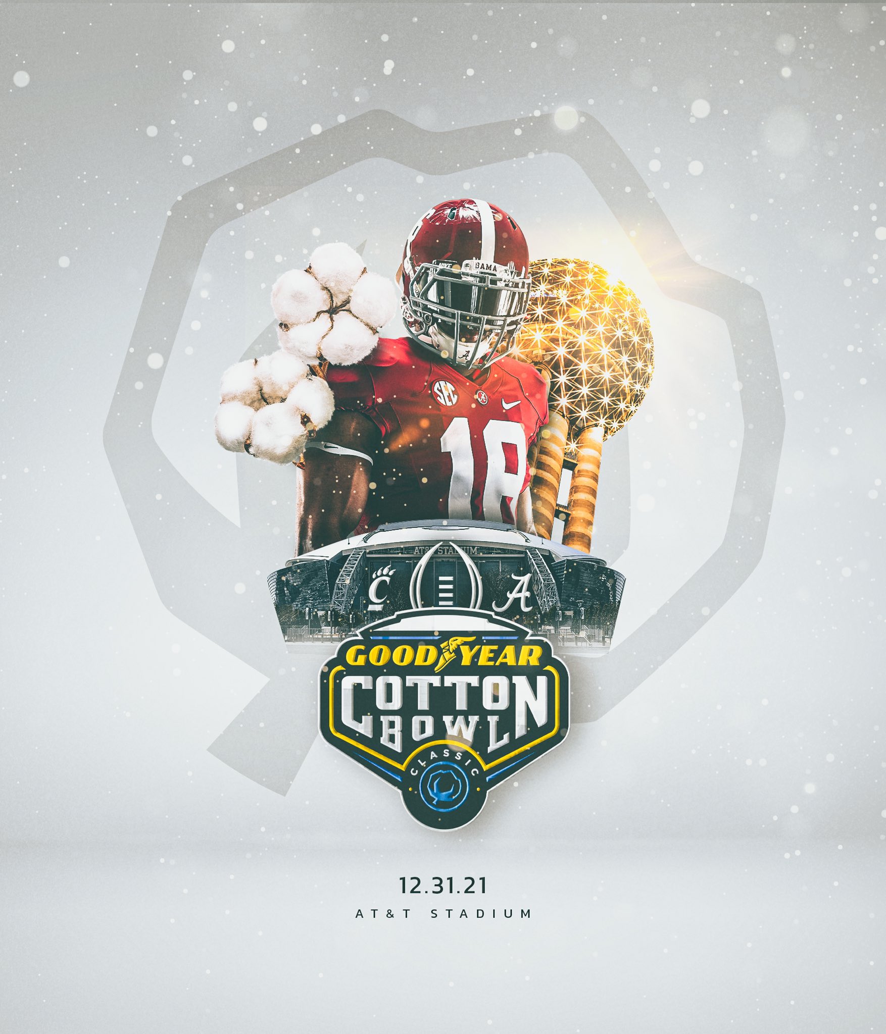 The top-ranked Alabama Crimson Tide will face off with the No. 4 Cincinnati Bearcats in the College Football Playoff Semifinal at the Goodyear Cotton Bowl Classic on Friday, Dec. 31, 2021 at AT&T Stadium in Arlington, Texas.