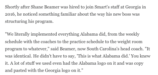 I heard a little of Kevin Steele on wjox today discussing the Ala and Ga defenses. He said both have some basic parts the are exactly the same, but over time as they self scout and offenses have changed there are arms that have grown and are different. He said that unless you have two future NFL cornerbacks it puts the DC in an uncomfortable position to play man on the receivers and bring another pass rusher. He said Ga did not do that all year and did not need to, but against Ala it didnt work. The question is will Kirby change this time. Steele said the biggest problem he thought for Ga was breakdowns on 3rd down. Greg Mc said well thats because Ala ran bunches. "I would run a bunch play every time on Ga". Steele kind of agreed with him that it was a problem for Ga. Cole asked about doubling Williams since he torched Ga last time. Steele said that is easy to do, but then you have the other side of the field to cover. He said Nick Saban and Kirby both have 5 star receivers over there that you might not know much about, but they know exactly what they can do. So you have your other corner in man on someone that you dont know much about, and he might be the next star of the game.