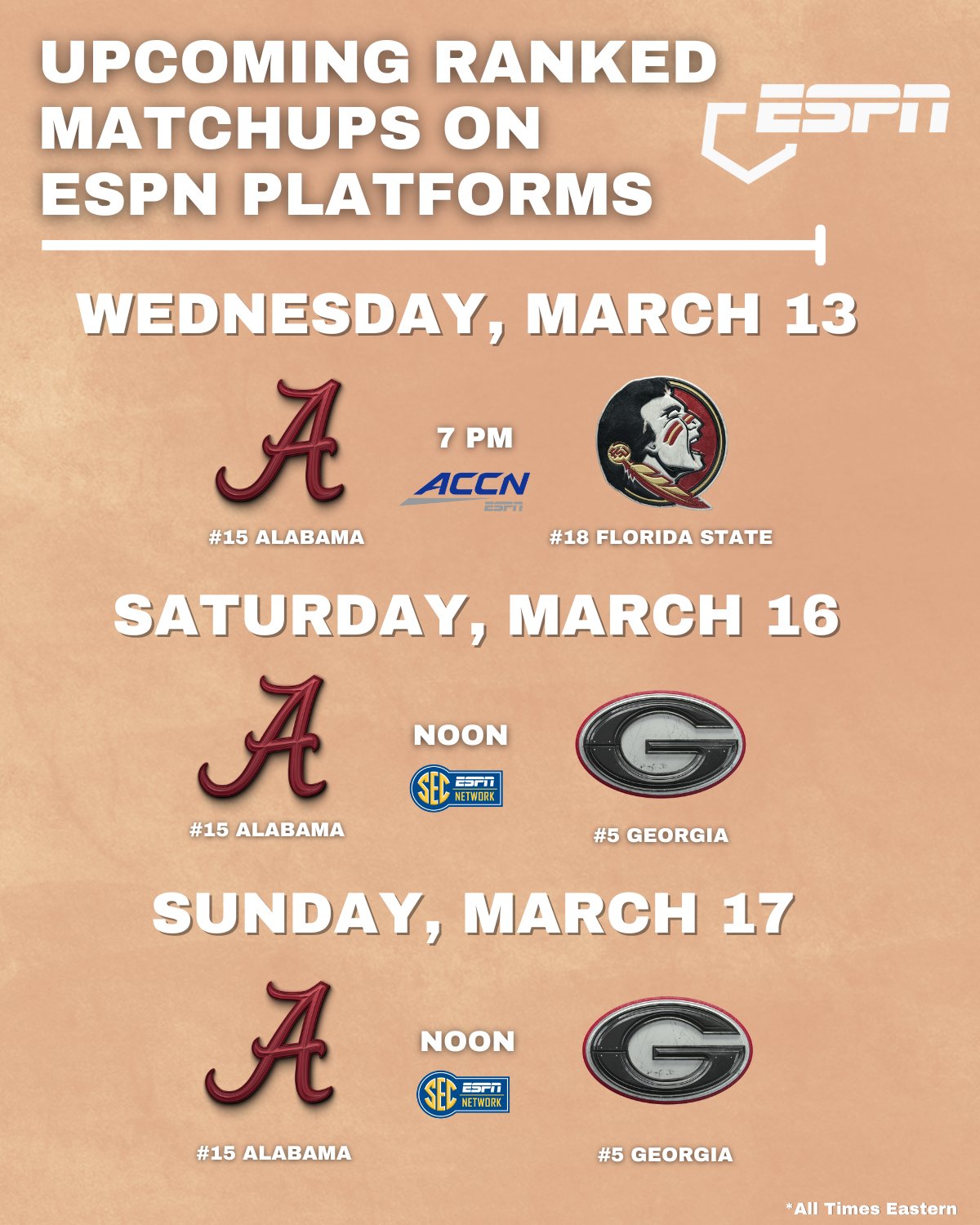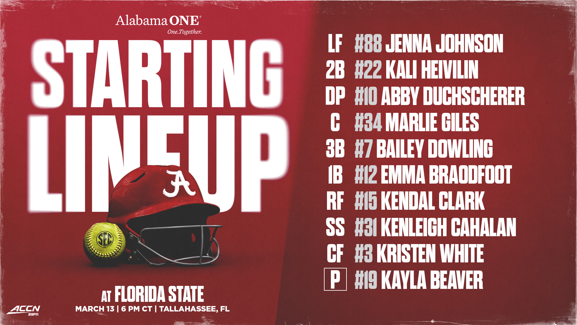 It will be a quick turnaround for 14th-ranked Alabama (19-3) as it hits the road for a Wednesday matchup against No.16 Florida State (15-5) in Tallahassee. First pitch between the Crimson Tide and Seminoles is set for 6 p.m. CT live on the ACC Network.