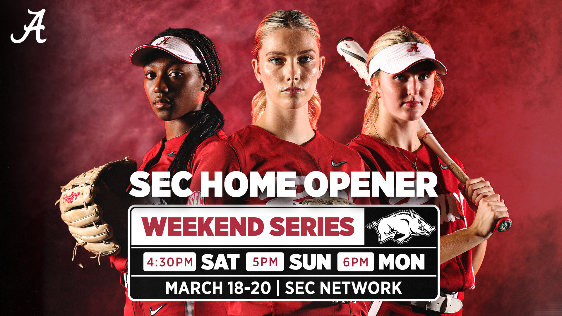 Alabama softball begins Southeastern Conference play this weekend at home, hosting Arkansas for a three-game series starting Saturday, March 18. All three games will be broadcasted live on the SEC Network.