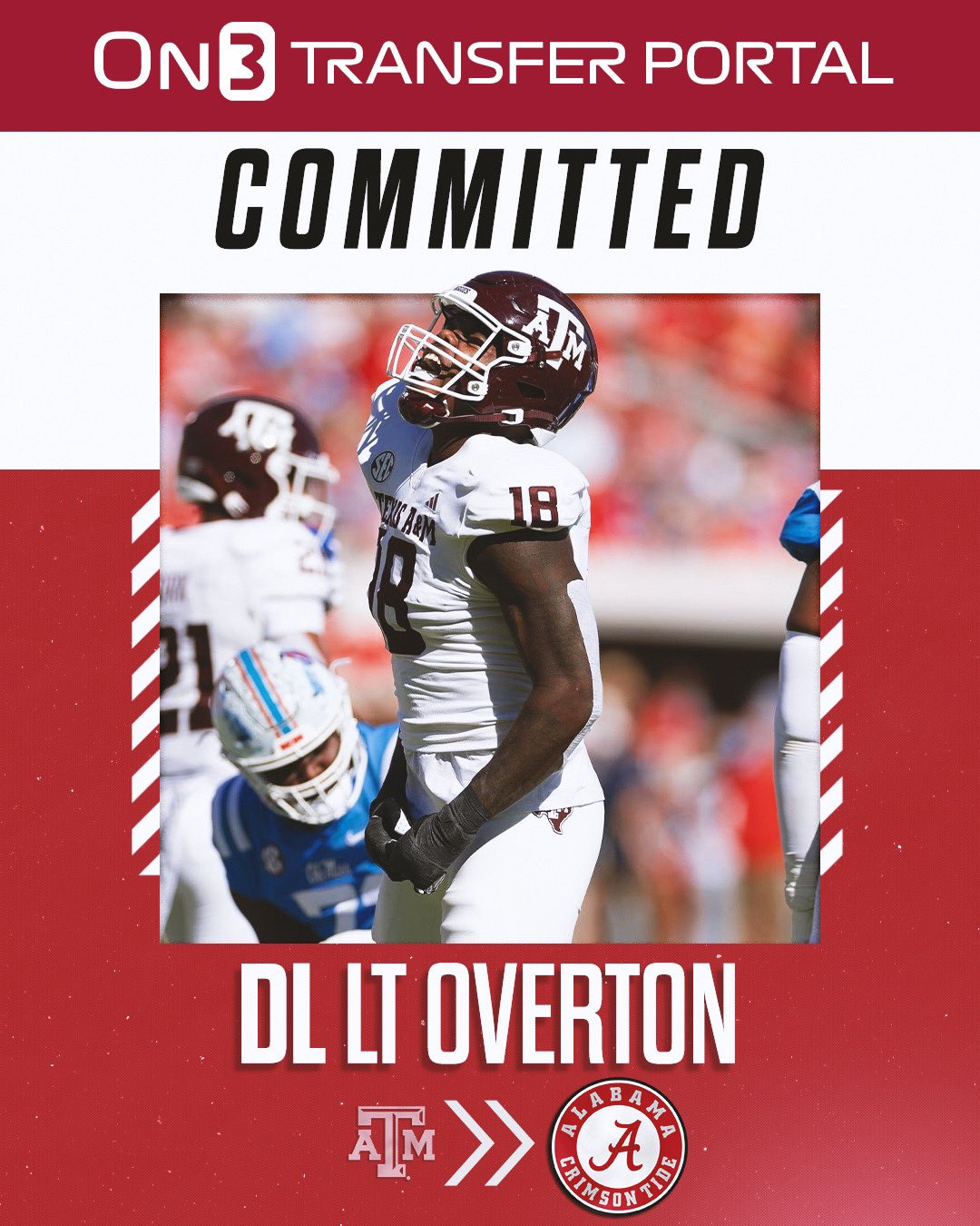 Texas A&M transfer defensive lineman LT Overton has committed to Alabama.