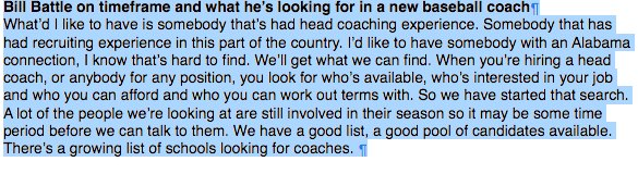 I wonder which will take precedence, prior head coaching experience or the Alabama connection?