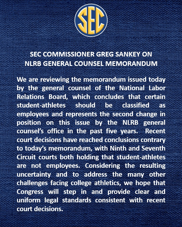 Statement from @SEC Commissioner Greg Sankey on today's NLRB general counsel memorandum related to college athletes.