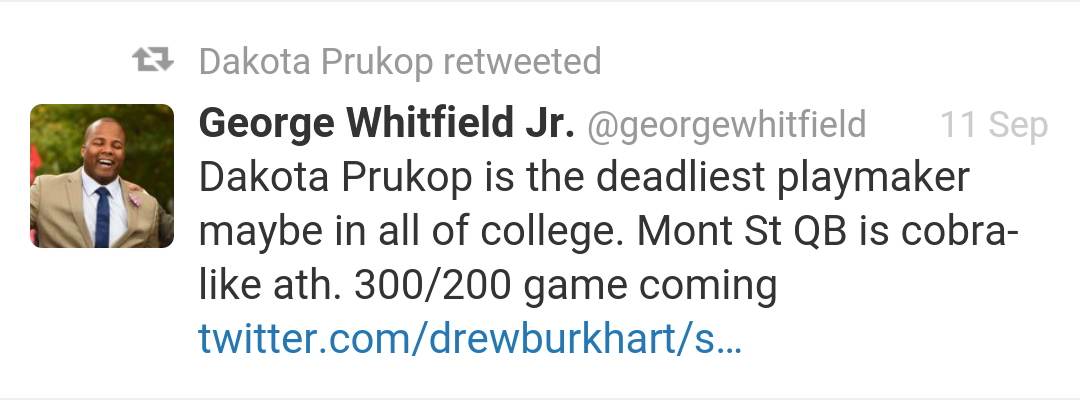 The Montana State quarterback took an official visit to Eugene to see Mark Helfrich and the Oregon Ducks. On Saturday night, Prukop boarded a red-eye for Tuscaloosa, Alabama to visit Nick Sabam and the Alabama Crimson Tide. In between, Prukop received offers from Jim Harbaugh’s Michigan Wolverines and Charlie Strong’s Texas Longhorn’s, the Austin native’s hometown team.