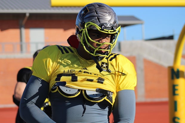 Do we have a candidate for No. 1? We've seen No. 1 players in San Antonio before and Clemson commit Dexter Lawrence had that kind of presence on the first day of practice for the East. Lawrence smoked the other defensive tackles in a 40-yard dash and looked downright speedy doing it. During 11on11 and one-on-ones he was dominant. Offensive linemen couldn't handle his blend of physicality and agility. Lawrence is special.