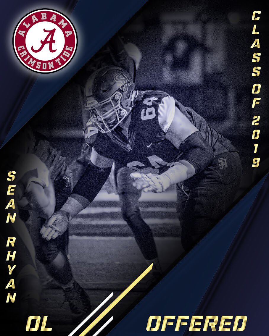@AlabamaFTBL has offered 2019 OL/DL Sean Rhyan. The Natl Champs have come to San Juan Hills for the #1 Lineman in the State. Congrats Sean! #RollTide #RFTB #BuiltAtTheBadlands #NoBetterPlace