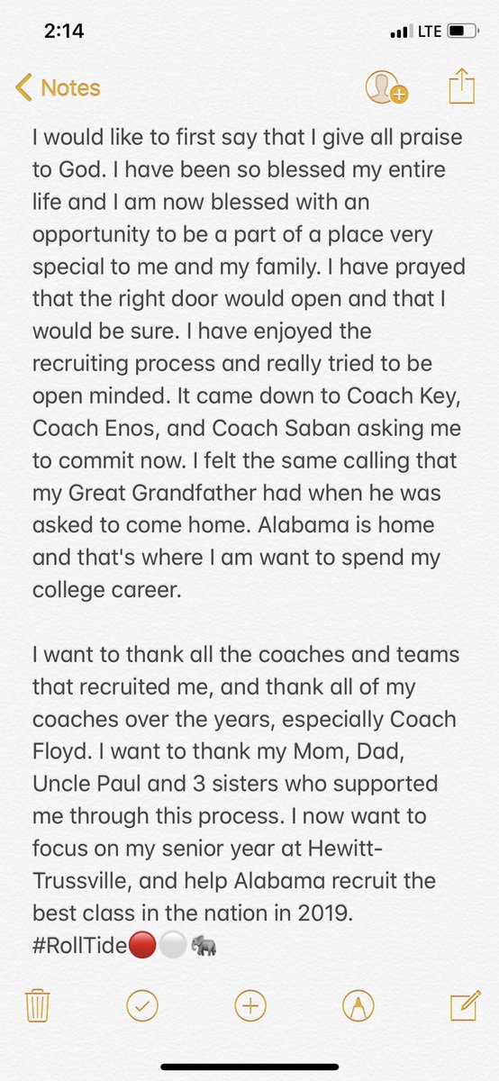 It goes without saying that the four-star quarterback grew up a lifelong Tide fan with his family ties to the program. He didn’t choose Alabama because of that, though. “I’m going to go to the place that best fits me,” he’s repeatedly said throughout the process. “Really just a place I can help that team win a national championship. I’m looking for the best fit for me.”