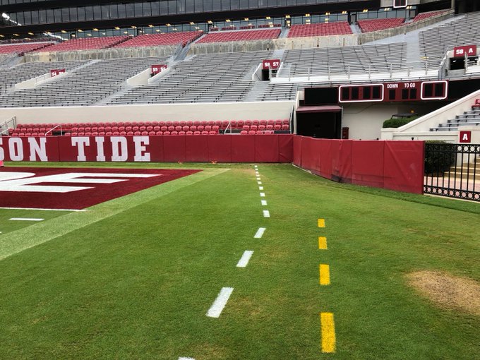 Great job by our Facilities & Operations Team! They have added at least 40" of additional space to the four corners of the field at Bryant-Denny Stadium. #RollTide